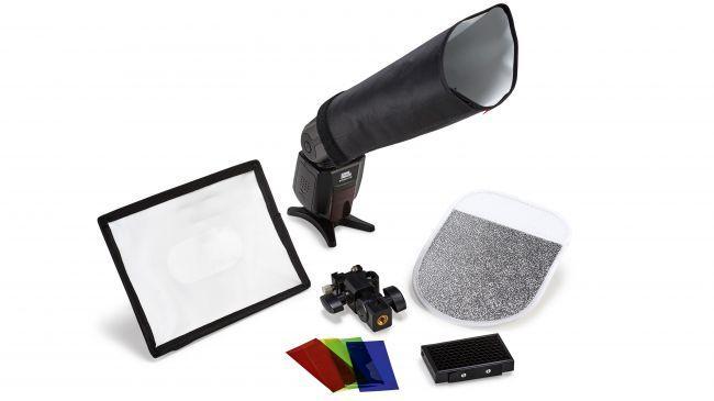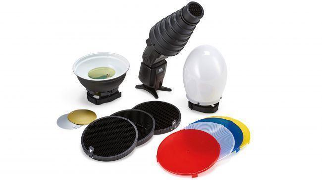 آیتمهای موجود در پک: زنبوری؛ رفلکتور؛ فیلترهای رنگی، اسنوت تاشو؛ براکت ایستاده فلاش