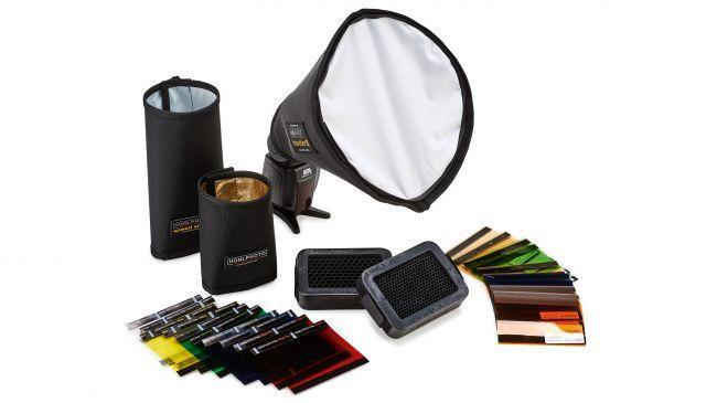 این کیت گسترده و کامل شامل یک سافت باکس مخروطی به طول 23 سانتی متر، اسنوتهای بزرگ و کوچک برای تمرکز بیشتر نور، کارت رفلکتور، نگهدارنده، زنبوریهای 3 و 6 میلیمتری به همراه سه بسته ژل رنگی است. از تجهیزات این کیت برای تصحیح رنگ، ایجاد جلوههای خلاقانه و ایجاد رنگهای پاییزی در عکس استفاده میشود. همچنین یک کیف نگهدارنده برای تمام آنها به همراه چهار تسمهی نگهدارنده از دیگر موارد این پک هستند.