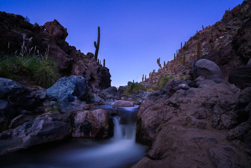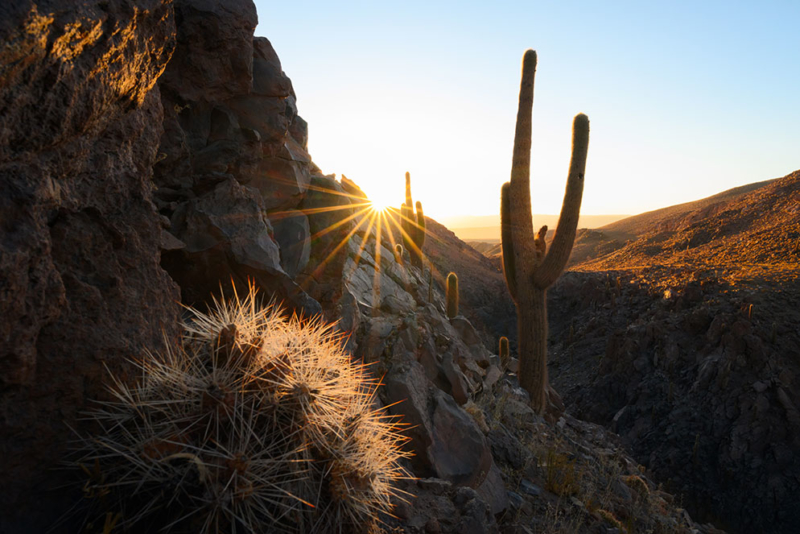 در مورد تصویر بالا؛ کاکتوس در دره گواتین ( شهر اگواسکالینتس، مکزیک ) در صحرای آتاکاما میتواند بیش از 20 فوت قد بکشد، و تیلور اغلب دوست دارد فاکتور انسانی را به این مناظر اضافه کرده و از آنها عکس بگیرد تا احساس متفاوتی را به تصاویرش ببخشد. او میگوید : ” ماه در آسمان بالا رفته بود و از سمت راست نور خودش را به زمین میتابید. من چراغ قوهای را نگه داشتم و نور آن را سعی کردم طوری تنظیم کنم که فضای داخلی سخره را روشن کند. این شکلی شبح وار و مبهم به تصویرم اضافه میکرد. “