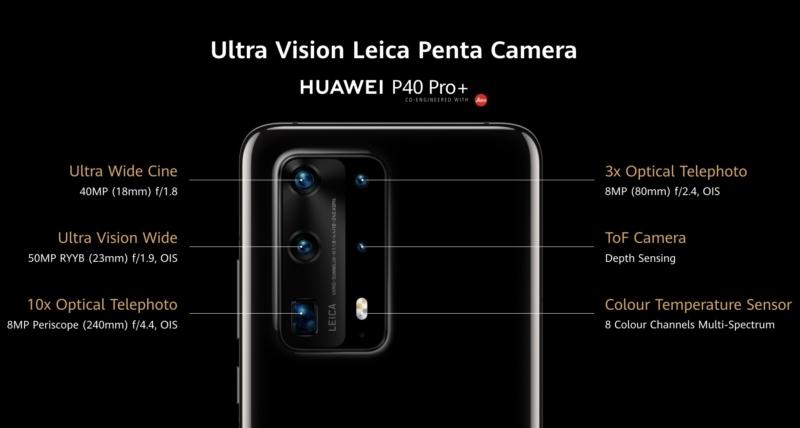 ماژول دوربین این گوشی طراحی پنج گانه داشته و بخش بزرگی از پشت بدنه را به خود اختصاص داده است. دوربین اصلی سنسوری 50 مگاپیکسلی بوده که دقیقا مانند نمونهی استفاده شده در P40 پرو است، اما در کنار آن از یک دوربین پریسکوپی با فاصله کانونی 240 میلی متری استفاده شده است که زوم اپتیکال 10 برابری را برای آن به ارمغان میآورد. این دوربین رزولوشنی برابر 8 مگاپیکسل داشته و همانند سنسور اصلی از لرزشگیر تصویر هم بهره میبرد.