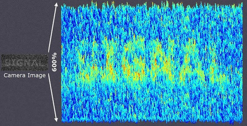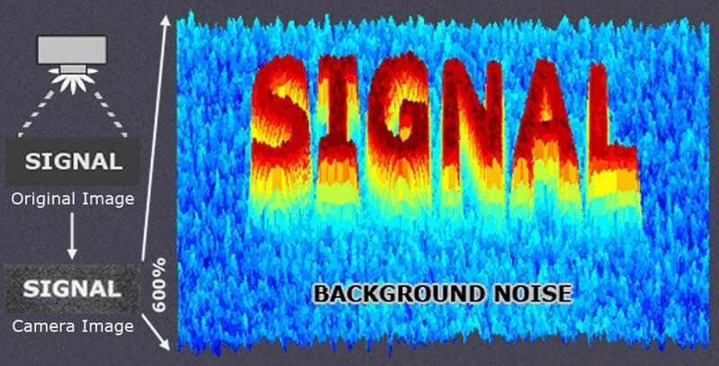 همیشه مقداری از نویز در سیستمهایی که سیگنالی را دریافت یا ارسال میکنند وجود دارد، برای تلویزیون این سیگنال اطلاعات پخشی “broadcast data ” انتقال یافته از طریق کابل یا آنتن و برای دوربین دیجیتال ، نوری که به حسگر حساس به نور دوربین ” CCD ” برخورد میکند؛ است. اگرچه وجود نویز در این نسبت اجتناب ناپذیر است، نویز میتواند آنقدر در مقابل سیگنال اصلی کوچک باشد که به نظر وجود نداشته باشد. نسبت سیگنال به نویز ” The signal to noise ratio/SNR ” یک راه مفید و جهانیِ مقایسه نسبت میزان سیگنال و نویز برای هر سیستم الکتریکیای است، نسبتهای بالا دارای نویز قابل مشاهدهی بسیار کم است، در حالیکه برعکس آن برای نسبتهای پایین صدق میکند. توالی تصاویر زیر نشانه میدهد چگونه یک دوربین، تصویری با نویز زیاد را از کلمهی سیگنال در مقابل یک پس زمینه ی صاف تهیه میکند. تصویر نتیجهی این فرآیند که به صورت سه بعدی بزرگ شده است، کلمه ی سیگنال را در مقابل پس زمینهای از نویز نشان میدهد.