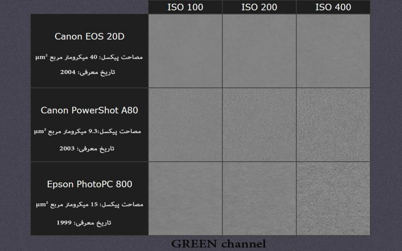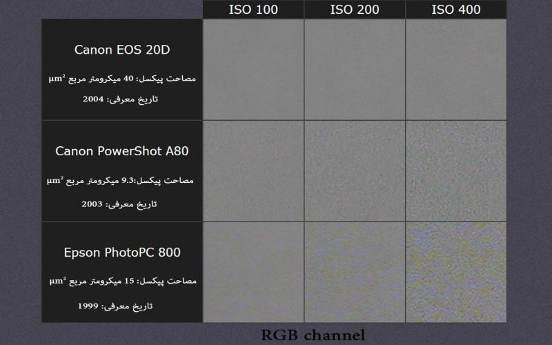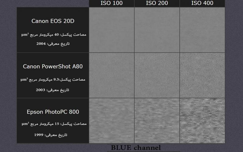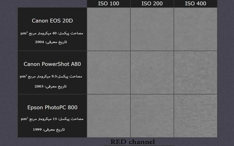 همچنین شما می توانید ببینید که چگونه همیشه با افزایش سرعت حساسیت، میزان نویز تولید شده در دوربین بالاتر میرود، هرچند این تغییرات نویز در بین دوربین های مختلف دارای پیچیدگیهایی است. با داشتن مصاحت پیکسل بزرگتر در سنسورهای دوربین، توانایی جمع آوری نور بیشتر شده و در نتیجه قدرت تولید سیگنال قویتری ایجاد خواهد شد. به عنوان یک نتیجه، دوربین هایی با پیکسلی که از نظر جسمی بزرگتر است به طور کلی نویز، کمتری در تصویرشان به نظر میآید، چرا که سیگنال آنها دارای نسبت بزرگتری به نویز است. به این دلیل است که دوربینهایی با مگاپیکسل بیشتر که در یک دسته از دوربین با یک اندازه ی سنسور قرار دارند لزوماً تصویری با ظاهر بهتر تولید نمیکنند. از طرف دیگر یک سیگنال قوی، لزوماً یک تصویر دارای نویز کمتر را ایجاد نمیکند، چرا که این نسبت سیگنال به نویز است که مشخص میکند چه میزان نویز در یک تصویر ایجاد شود. همانگونه که در مثال بالا دوربین “Epson PhotoPC 800” دارای مصاحت پیکسل بسیار بیشتری از دوربین “Canon powerShot A80” بود، اما در نگاه بصری دارای نویز بیشتری است، به خصوص در حساسیت 400. این مسئله به این دلیل است که دوربین بسیار قدیمیتر اپسون دارای سطح نویز داخلی بسیار بالاتری است؛ که به دلیل سیستم الکترونیکی کمتر پیچیدهی آن ایجاد میشود.