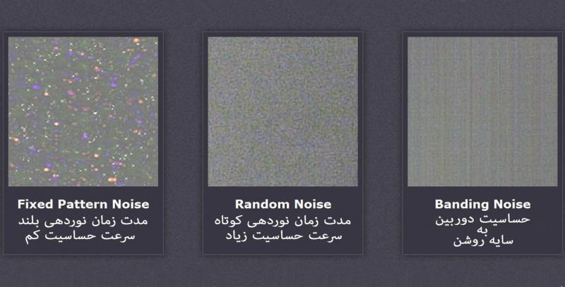 دوربینهای دیجیتال، نوع رایج نویز را ارائه میدهند: نویز نامنظم، نویز الگوی ثابت و نویز نواری. سه نمونهی کیفی زیر نشان دهندهی شکل ظاهری و الگوی قرارگیری هر کدام از این انواع نویز در برابر یک پس زمینهی صاف است.