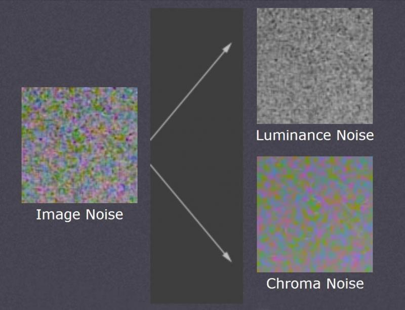 نویز همچنین از ترکیب دو عامل تشکیل میشود: نوسانات در رنگ و درخشنگی. رنگِ نویز {Chroma} معمولا در ظاهر، بیشتر غیر معمول بوده و اگر تحت کنترل نگه داشته نشود، میتواند باعث ارائهی تصویری غیر قابل استفاده گردد. مثال زیر چیزی را که در اصل قسمتی از سوژهای به رنگ خاکستری خنثی است را به همراه جلوهی جداگانهی نویز یعنی رنگ و درخشنگی نشان میدهد.