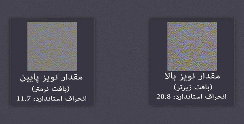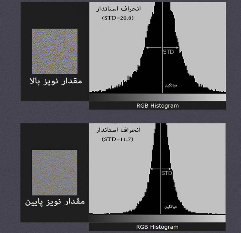 دقت کنید که چگونه نمونهی سمت چپ ظاهری بسیار نرمتر از نمونهی سمت راست دارد. مقدار نویز بالا میتواند بافتهای ریز مانند پارچه یا شاخ و برگ درختان را مخدوش کند و همچنین حذف آن از تصویر بدون نرم کردن زیاد تصویر میتواند بسیار دشوار باشد. مقدار نویز، معمولا بر اساس یک اندازه گیری آماری که انحراف استاندارد نام دارد، توصیف میشود که مشخص کنندهی کمیت مقدار تغییرات معمول یک پیکسل نسبت به ارزش واقعی ( ارزش نوری که از دنیای واقعی به حسگر دوربین میرسد ) آن است. همچنین میتوان این مفهوم را با نگاه کردن به نمودار ستونی “Histogram” هر نمونه درک کرد.