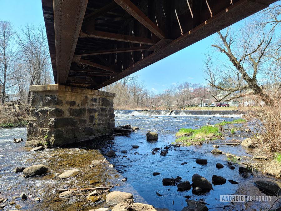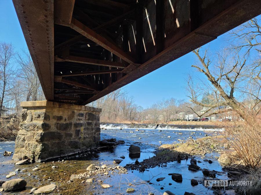 در تصویر ثبت شده از دیوار سنگی، تقریبا میزان کنتراست و جزئیات یکسان است، اما تصویر سمت راست نویز بیشتری دارد. در مورد تصاویر پایین در زیر پل نیز همین مسئله صادق است. باز هم، اشباع بیش از حد رنگ سبز در تصویر سمت راست بسیار جالب است، گرچه رنگ آسمان در آن اندکی مردهتر و کمرنگتر است.