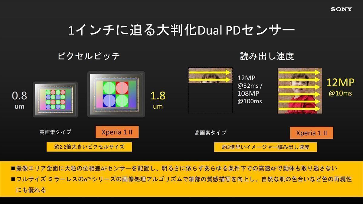 سونی میگوید گوشی جدیدش میتواند دادههای مربوط به تمام سطح حسگر را در عرض تنها 10 میلی ثانیه بخواند. این در حالی است که حسگرهای 108 مگاپیکسلی ( شبیه به آنچه قبلا در گلکسی S20 اولترا دیده بودیم ) برای خلق تصویری ۱۲ مگاپیکسلی به ۳۲ میلی ثانیه زمان نیاز دارند. همچنین گوشیهای مجهز به حسگر ۱۰۸ برای خواندن دادههای مربوط به تمام سطح حسگر به ۱۰۰ میلی ثانیه زمان نیاز پیدا میکنند. سونی میگوید بزرگ بودن اندازهی پیکسلها و بالا رفتن حساسیت باعث میشود زمان خوانده شدن دادههای مربوط به حسگر ۱۲ مگاپیکسلی اکسپریا 1 مارک ۲ بسیار کوتاه باشد.