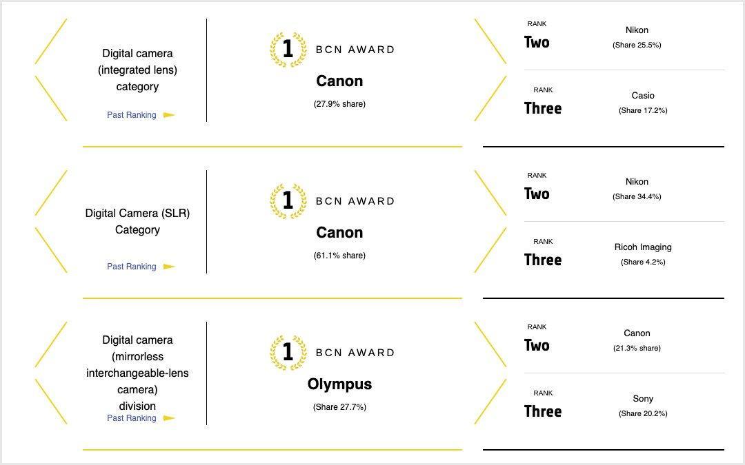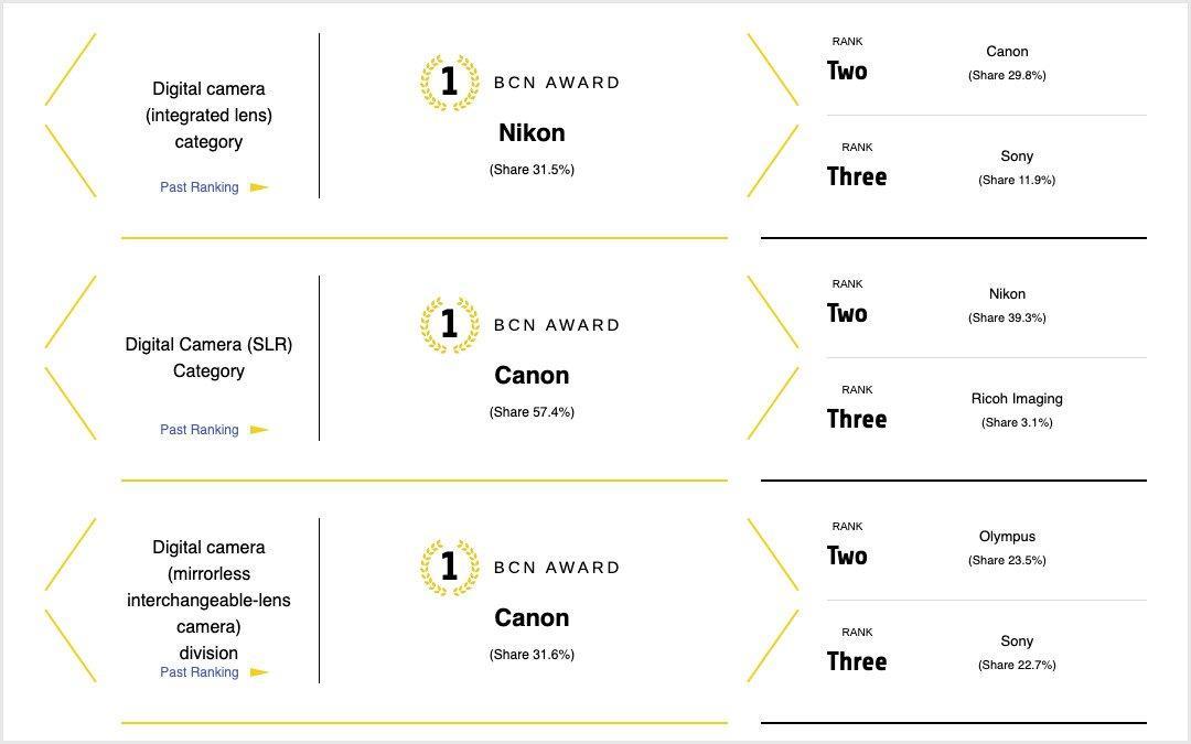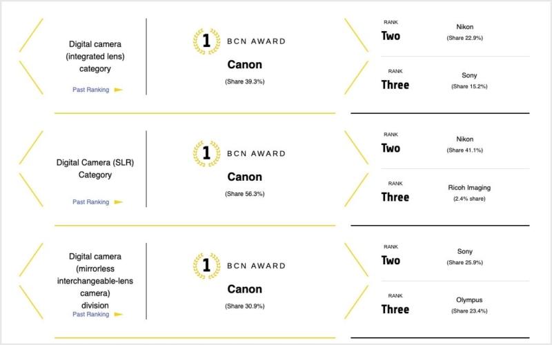 BCN برندگان جوایز خود را برای سال 2020 میلادی اعلام کرده است و مهمترین خبر از آمار فروش دوربین امسال این است که سونی با غلبه بر الیمپوس ادعا کرده است که جایگاه دوم را در دسته بندی بازار بدون آینههای ژاپن کسب کرده است. کانن نیز برای اولین بار توانسته رتبه اول را در میزان فروش هر سه دسته از دوربینهای دیجیتال در سال جاری به دست بیاورد.