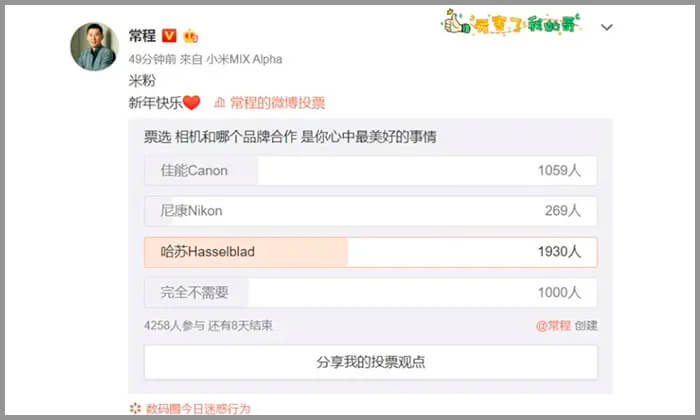 دوربین عکاسی همه چیز از نتیجه یک نظرسنجی که شیائومی در وبسایت Weibo منتشر کرد شروع میشود. در این نظرسنجی از کاربران خواسته شد که بگویند دوست دارند کمپانی شیائومی با کدام یک از کمپانیهای بزرگ دنیای عکاسی همکاری کند. در بین این گزینهها، کانن، نیکون، هاسلبلاد و گزینه ” No need ” به معنی عدم همکاری با یک کمپانی شخص ثالث را داشتیم. نکته این است که این نظرسنجی تأثیر بسیار خوبی داشته و پس از ثبت بیش از 4000 رای، نتیجه به نفع کمپانی هاسلبلاد بود. این کمپانی بیش از یک بار در منابع معتبر عکاسی در دنیا عنوان بهترین دوربینها را کسب کرده است.
