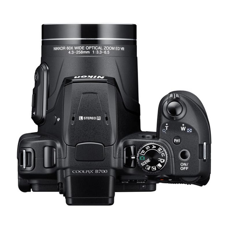 دوربینCoolpix B700 محصول شرکت نیکون است. این شرکت تولیدکننده انواع دوربینهای عکاسی و فیلمبرداری و لوازم جانبی آن است. دوربین نیکون b700 خوشدست ۵۶۵ گرم وزن دارد و در ابعاد ۱۲۵×۸۵×۱۰۷ میلیمتر است. در این دوربین از حسگر BSI CMOS با دقت ۲۱ مگاپیکسل و دقت مؤثر ۲۰ مگاپیکسل استفادهشده، و ابعاد حسگر آن ۱/۲٫۳ ” (۶٫۱۷ × ۴٫۵۵ mm) است. لنز این دوربین با فاصله کانونی۱۴۴۰-۲۴ میلیمتر و دارای لرزشگیر تصویر است. این دوربین با کیفیت ۴K و با حداکثر سرعت فیلم ۳۰ فریم بر ثانیه فیلم برداری می کند. حساسیت Coolpix B700 از۱۰۰ شروع می شود و تا ۳۲۰۰ قابل تغییر است. زوم ۶۰ برابری این دوربین که با لنز شیشه ای NIKKOR ED انجام می شود این قابلیت را به کاربر می دهد که از دورترین سوژه ها و چشم اندازها ، نماهای بسته (close-up ) بگیرد. حتی اگر زوم ۶۰ برابری اپتیکال کافی نباشد می توان از زوم دیجیتال ۱۲۰ برابری استفاده کرد. با استفاده از این زوم ها می توانید از دورترین سوژه ها عکس بگیرید. دیگرعکس های محو و بی کیفیت را که در نتیجه ی زوم زیاد یا تکانهای دوربین ایجاد می شوند کاملا فراموش کنید. دوربین نیکون Nikon Coolpix B700 مجهز به سیستم Dual Detect Optical VR است که با بهبود عملکرد VR موجب کاهش تکانهای دوربین می شود و به ایجاد وضوح و شفافیت در عکس نهایی کمک می کند و حتی در فایل های ویدیویی نیز موجب کاهش تکانهای دوربین و در نتیجه تصویری ایستا و شفاف می شود. عملکرد VR تنها به ارتقا کیفیت عکس ها هنگام زوم منجر نمی شود، بلکه در شرایط نوری اندک نیز به بهبود عملکرد دوربین می انجامد. سیستم نوردهی چندگانه (Multiple Exposure Lighten) چندین تصویر را بصورت یک فریم ذخیره می نماید، که به طرز چشمگیری در تصویربرداری از سوژه های متحرک مانند نور افشانی ها مؤثر است. گزینه های حالت خلاقانه (Creative Mode) با فیلترها و جلوههای متنوع این امکان را به ما می دهد که تصاویری هنری در دوربین ایجاد نماییم. فیلمهای سریع (Superlapse) قابلیتی است که مانند قابلیت Time Lapse، حرکات را بصورت ویدیوهای سریع در دوربین ثبت مینماید. تنظیمات نوردهی استاندارد P/S/A/M امکان کنترل دستی مؤلفه های مختلف را به شما می دهد. باتری این دوربین EN-EL23 مطابق تستهای انجام شده تا بیشتر از ۳۵۰ شات را شارژدهی میکند. حالت های ویرایش تصاویر داخل دوربین مانند کپی، D-Lighting، فیلترها، افکت های سریع، رتوش سریع نیز برای تمامی عکس های ثبت شده در دسترس است.