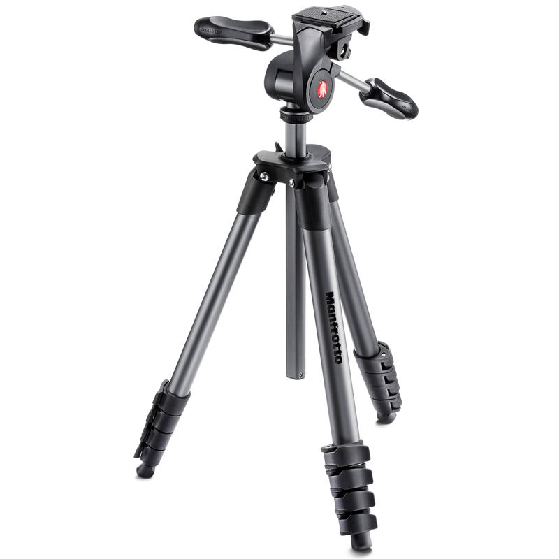 سه پایه مشکی مانفرتو مدل Compact Advanced Aluminium Tripod از ابزارهای مهم دوربین است که می تواند تا وزن ۳کیلوگرم را پشتیبانی کند. این سه پایه برند مانفرتو قابلیت گسترش ابعاد از ۴۴٫۵ تا ۱۶۵ سانتی متر را دارد و وزن آن ۱٫۴ کیلوگرم است. پایه های پنج بخشی این سه پایه مانفرتو از طریق قفل های به خصوصی تحت عنوان flip locks حفاظت می شوند. هد سه جانبه چرخان pan/tilt که روی سه پایه نصب شده است دارای دو دستگیره بوده که روی یکدیگر تا می شوند تا در زمانی که از سه پایه استفاده نمی کنید فضای کمتری اشغال شود. یکی از دستگیره ها عمل paning یا در اصطلاح چرخش عمودی را به عهده دارد در حالی که دسته دیگر باعث چرخش افقی می گردد. یک صفحه با قابلیت آزادسازی سریع نیز به منظور اتصال به دوربین از طریق پیچ مخصوص وجود دارد. از امکانات جانبی سه پایه Manfrotto Compact Advanced نیز می توان به کیف حمل پوشش دار برای حفاظت از سه پایه دوربین حین حمل و نقل آن اشاره کرد.