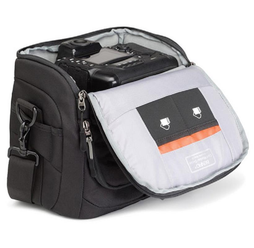 کیف دوربین عکاسی بنرو Coolwalker S30 از بسیاری جهات به مانند S10 و S20 است تنها کمی از آنها بزرگتر است. کیف بنرو S10 سایز متوسط مجموعه کیف های Coolwaker یا شانه آویز است که برای قرار دادن یک دستگاه دوربین DSLR و یک لنز متوسط بکار می رود. شکل این کیف بصورت مربعی شکل است و شما به دو صورت بدنه و لنز جدا یا دوربین و لنز به هم متصل شده می توانید از آن استفاده کنید. علاوه بر این می توانید یک فلاش اکسترنال و یک باطری گریپ هم داخل آن قرار دهید. در پشت درب کیف نیز دو جای کارت حافظه به زیبایی قرار داده شده است.