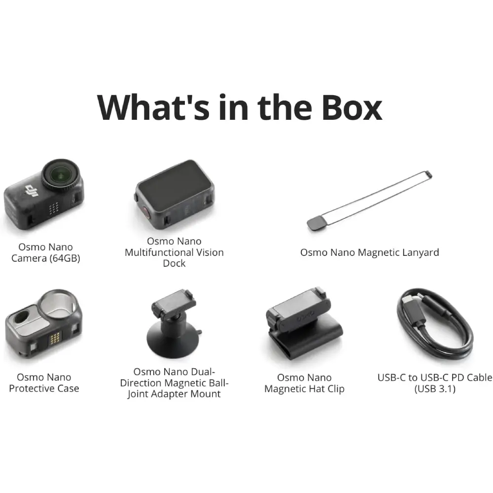 در پکیج استاندارد Osmo Nano علاوه بر خود دوربین با حافظه داخلی ۶۴ گیگابایت، لوازمی مانند Vision Dock، گیره کلاه مغناطیسی، بند مغناطیسی، کیف محافظ، کابل USB-C و پایه اتصال دو جهته قرار گرفته است. بسیاری از برندهای دیگر این تجهیزات فیلمبرداری را به صورت جداگانه عرضه میکنند، اما DJI همه را در یک مجموعه کامل ارائه میدهد. این موضوع هم از نظر اقتصادی بهصرفهتر است و هم تجربه کاربری راحتتری فراهم میسازد.