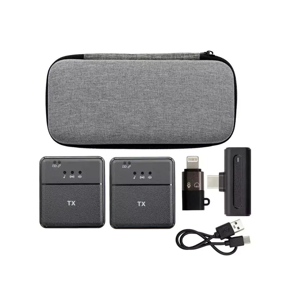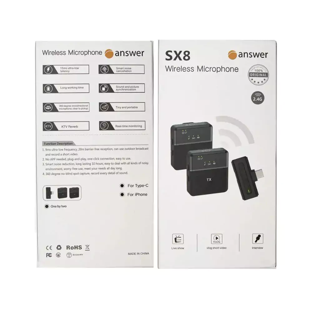 میکروفون Answer SX8 با ویژگیهایی چون تبدیلهای لایتنینگ و Type-C به شما این امکان را میدهد که به راحتی به دستگاههای مختلف متصل شوید. این سیستم دارای دو فرستنده و یک گیرنده است که امکان ضبط صدای همزمان از دو نفر را فراهم میآورد. ولتاژ ورودی میکروفون 5 ولت است و با برد 20 الی 30 متر بدون مانع، امکان استفاده از آن در فضاهای باز یا بزرگ را فراهم میکند.