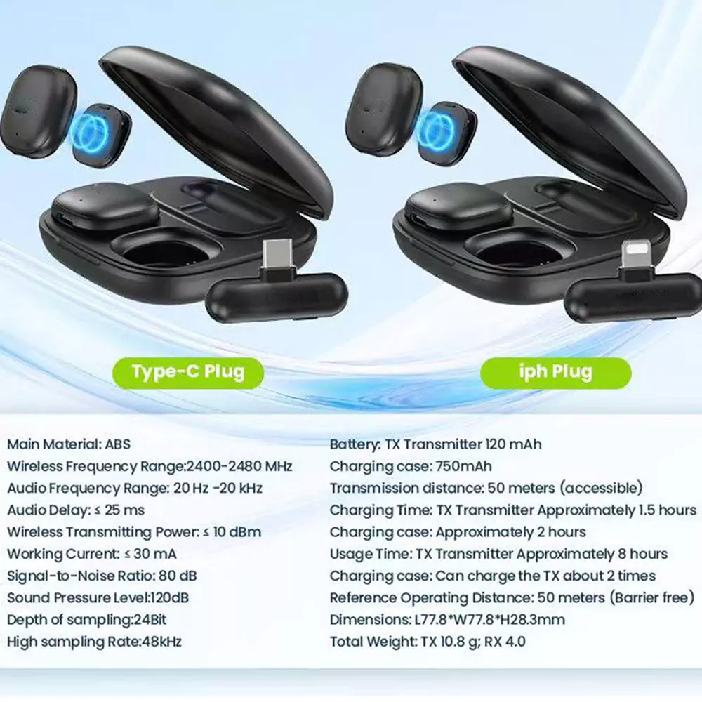 ابعاد کوچک 32×32×20 میلیمتری و وزن 10.8 گرمی فرستنده باعث میشود حمل و استفاده از آن بسیار آسان باشد. این طراحی «Coin Size» باعث شده تا میکروفون تقریباً روی لباس دیده نشود و تجربهای مینیمال و حرفهای برای کاربر فراهم شود. از سوی دیگر، پشتیبانی همزمان از Type-C و Lightning باعث میشود این محصول برای کاربران اندروید و آیفون به یک اندازه کاربردی باشد.
