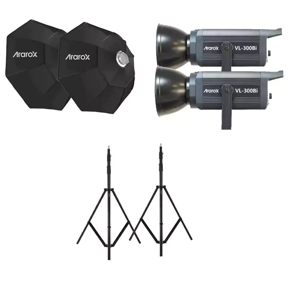 شامل: دو عدد Ararox VL300، دو عدد اکتاباکس 90 سانتی متر آراروکس، دو عدد سه پایه نور ایلکین iA-260LS
