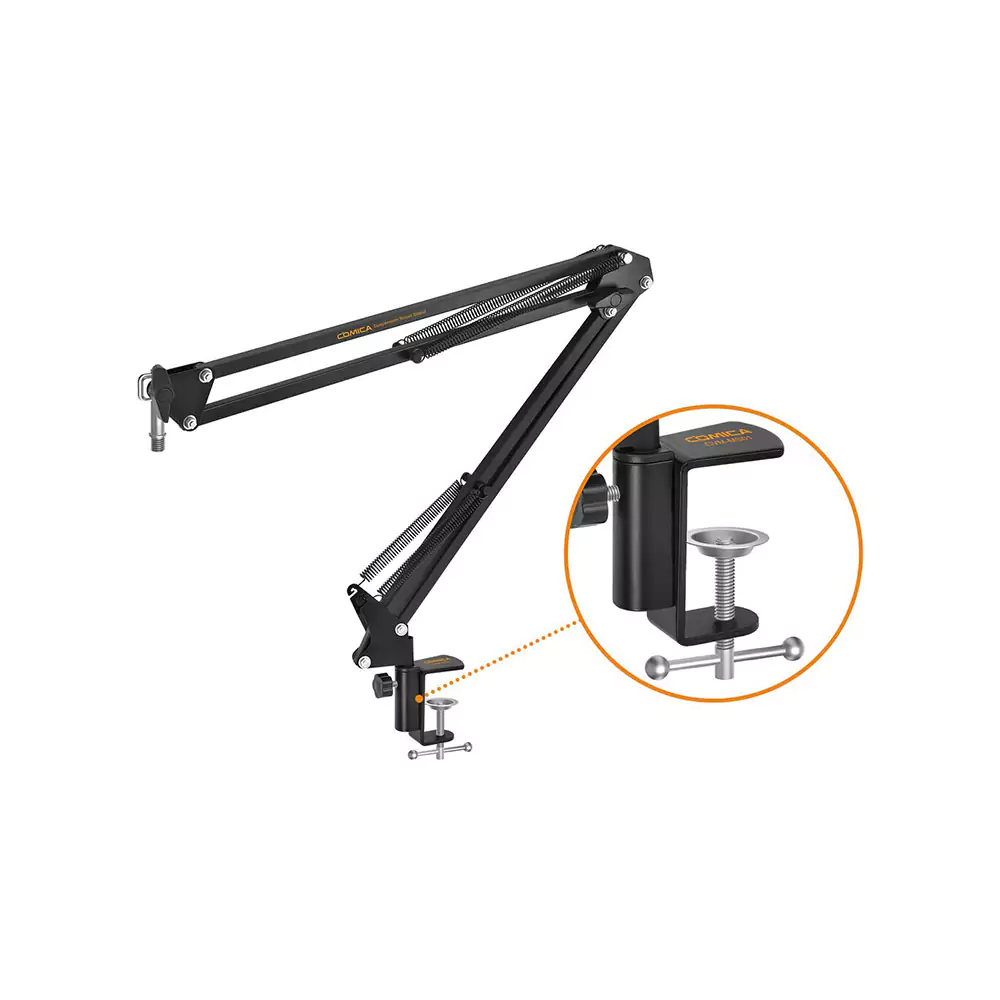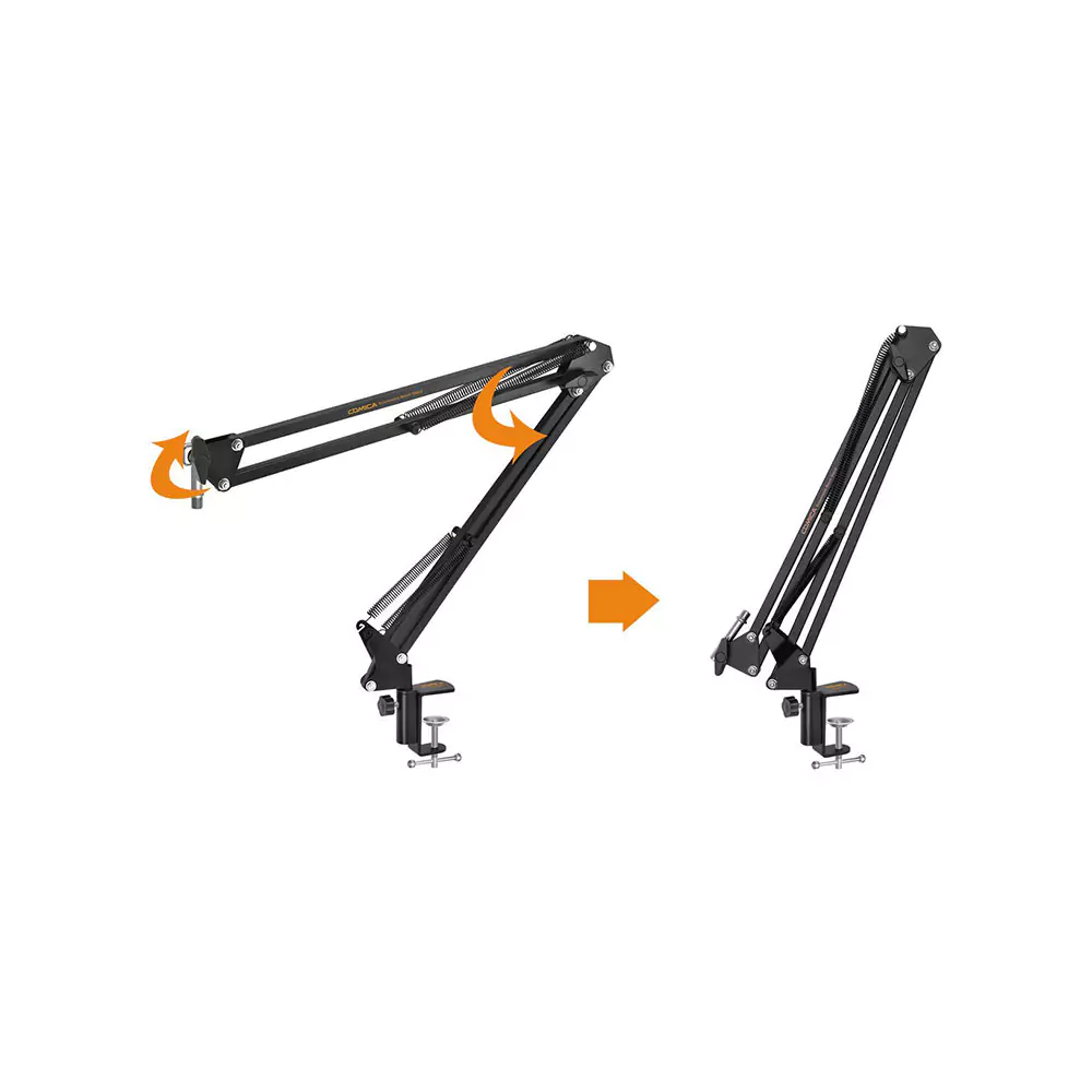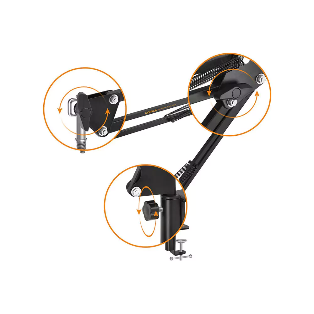 پایه میکروفون کامیکا CVM-MS01 یک بازوی قابل تنظیم است که قادر است تا ۵۵ سانتیمتر به صورت افقی و ۶۲ سانتیمتر به صورت عمودی تغییر وضعیت دهد. این قابلیت تنظیم ابعاد به شما این امکان را میدهد که میکروفون را در هر زاویهای تنظیم کنید و به راحتی آن را در موقعیت دلخواه قرار دهید. همچنین این پایه با استفاده از بست گیرهای C-Clamp به راحتی به میز متصل میشود و میتواند روی انواع میزهایی با ضخامت ۱ تا ۵ سانتیمتر نصب شود.