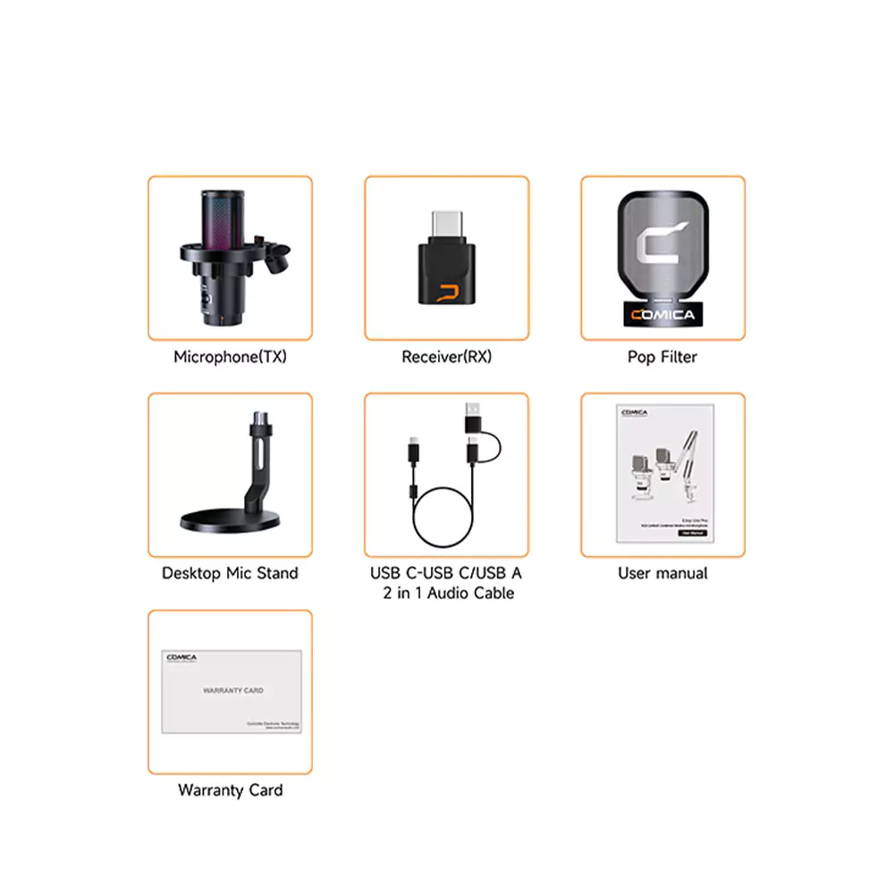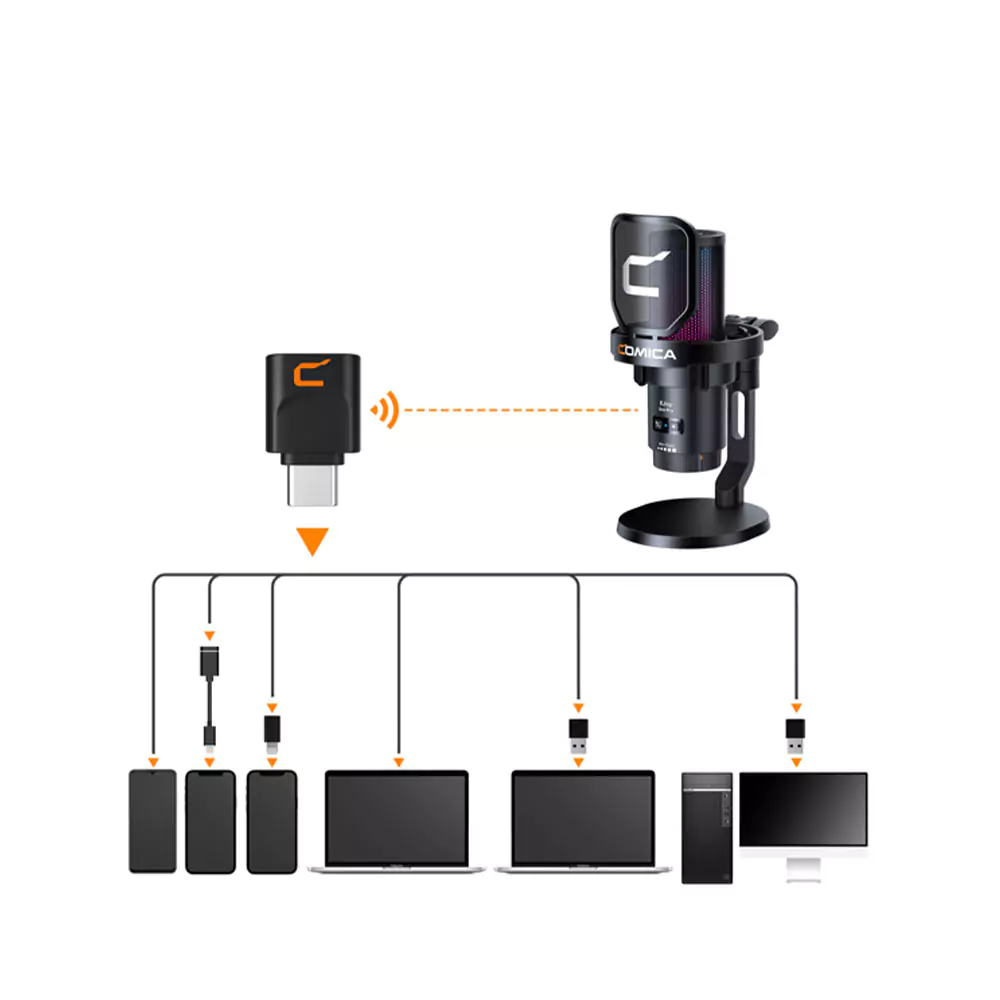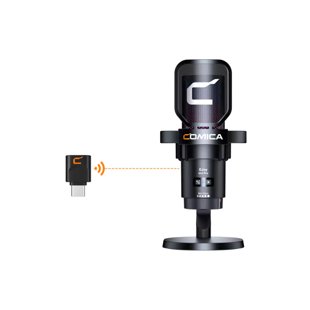 میکروفون COMICA EJOY UNI PRO با انواع موبایلها با پورت تایپ سی و آیفونهای مدل 15 و 16 سازگار است. علاوه بر این، بدون نیاز به کارت صدای جداگانه، میتواند به لپتاپها و کامپیوترها متصل شود. باتری این میکروفون نیز عملکرد فوقالعادهای دارد؛ در صورت روشن بودن نور RGB، تا 20 ساعت شارژدهی ارائه میدهد و در صورت خاموش بودن نور RGB، این زمان به 50 ساعت افزایش مییابد.