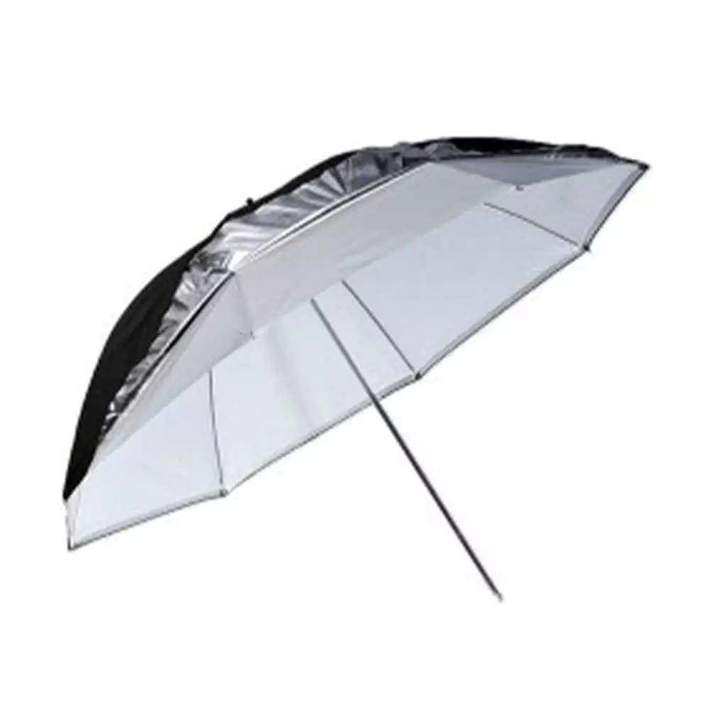 چتر بازتابی نقرهای-مشکی 90 سانتیمتر دولایه: این چتر با پوشش نقرهای در داخل و مشکی در بیرون، باعث بازتاب بیشتر نور و جلوگیری از نشت نور به محیطهای اطراف میشود که در نتیجه نوردهی قویتر و متمرکزتری خواهید داشت.