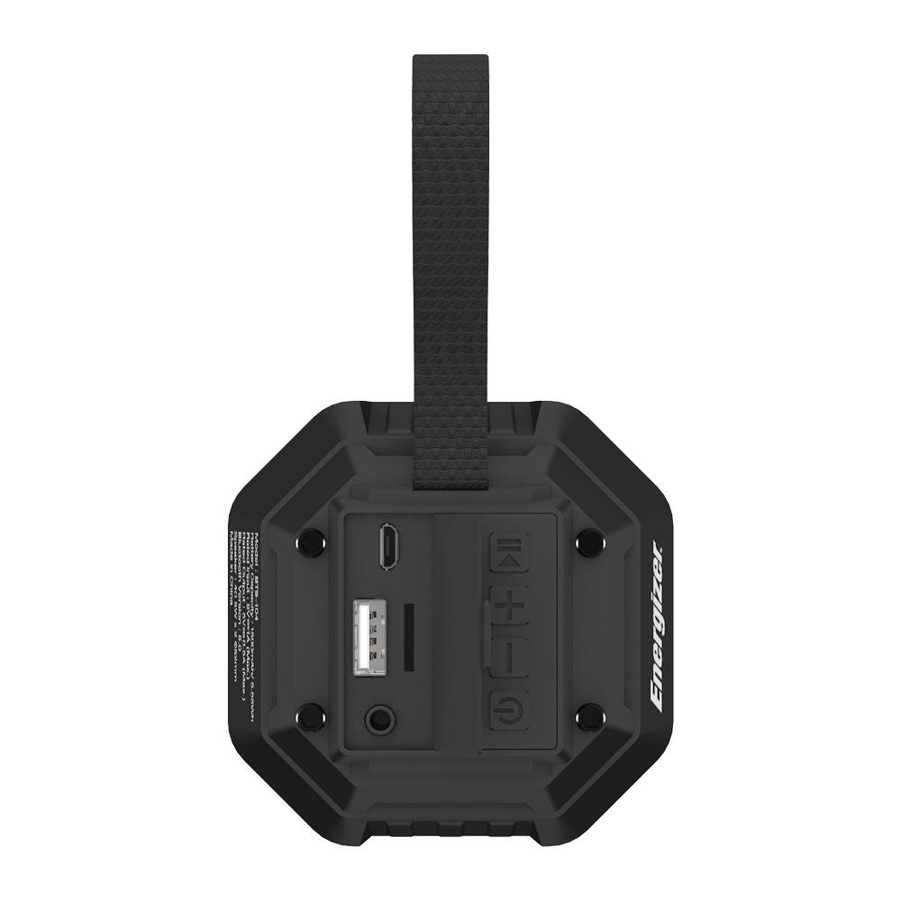 اسپیکر قابل حمل انرجایزر، استوانهای شکل بوده و مجهز به بند مخصوص برای حمل اسپیکر میباشد. در دو انتهای این اسپیکر دو روکش پلاستیکی وجود دارد. که در یک سمت دکمه های کنترلی کم و زیاد نمودن صدا، پاور و جست و جو در قسمت بالای این بخش و در پایین آن پورت های AUX، USB، ورودی کارت میکرو و درگاه شارژ قرار دارد که توسط یک روکش محافظ پوشانده شده است. هم چنین روی اسپیکر یک لایۀ پارچهای وجود دارد، که از آسیب به اسپیکر جلوگیری میکند.