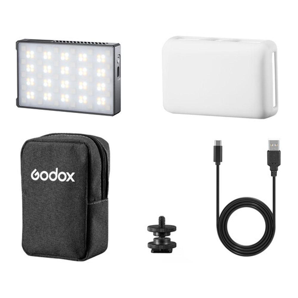 نور ثابت RGB گودکس مدل C5R Knowled LED یک پنل 10.6 در 6.8 در 1.8 سانتیمتری است. وزن این محصول هم سبک و قابل حمل برابر 169 گرم است. محتویات جعبه علاوه بر نور اصلی شامل یک Collapsible Diffuser، کابل USB Type C، Cold Shoe Base و یک کیف حمل و نقل میباشد.