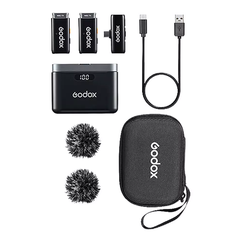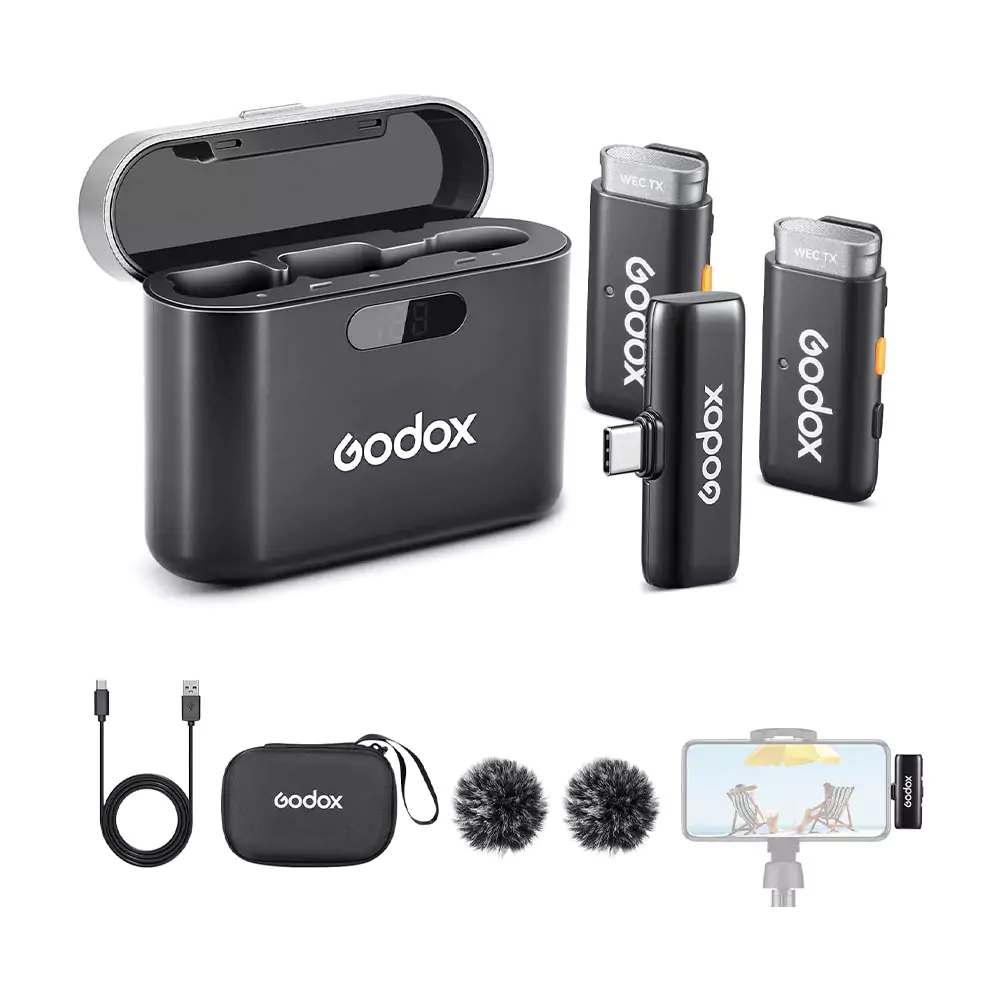 میکروفون Godox WES2 با طراحی ویژه برای عکاسی و فیلمبرداری دو نفره، کارایی بسیار بالایی دارد. این میکروفون شامل دو فرستنده میکروفون لاوالیر (کلیپدار) است که صدای هر دو نفر را به صورت همزمان ضبط میکند و به شما این امکان را میدهد که در پروژههای چند نفره مانند مصاحبهها یا تولید محتوای گروهی از آن استفاده کنید. در ادامه به بررسی مشخصات فنی این میکروفون خواهیم پرداخت: