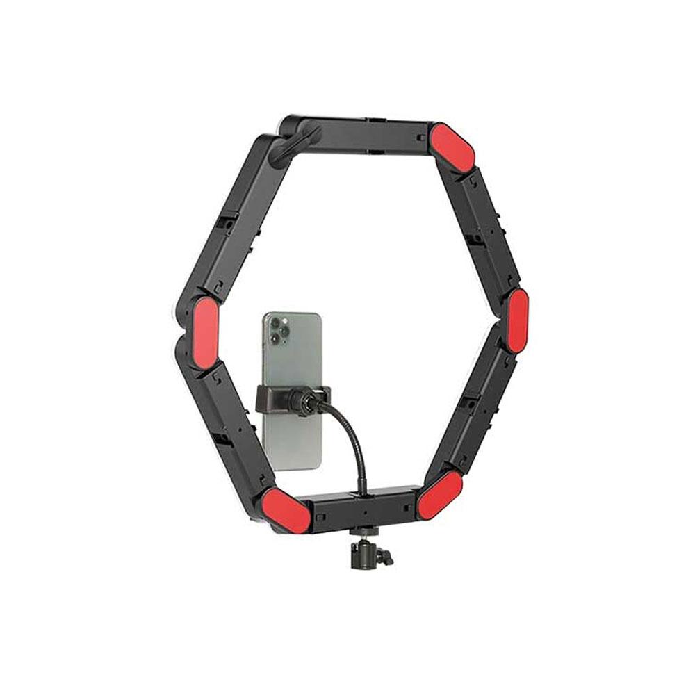 این رینگ لایت، از یک طراحی منحصر به فرد بهره میبرد و 6 بازوی قابل تنظیم دارد. این بازوها، هر کدام 19.5 سانتیمتر هستند. در کنار هر بازو، یک ضامن تعبیه شده که اجازه تنظیم بازوها را به شما میدهد. شما میتوانید نورها را به اشکال مختلف در بیاورید و مربع، مثلت، اعداد و اشکال جذابی مثل ضربان قلب تولید کنید.