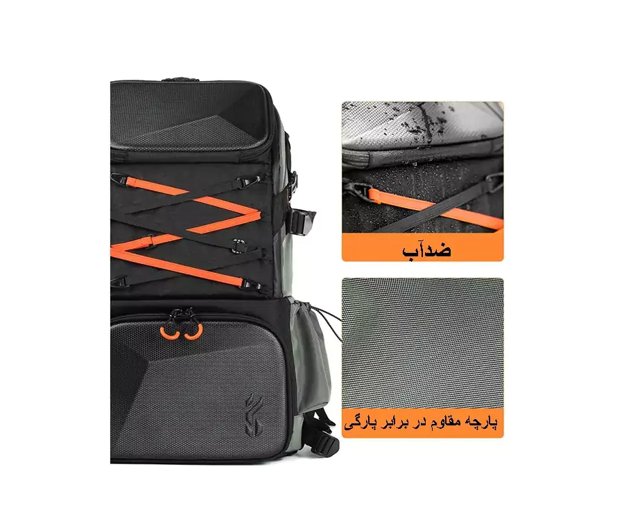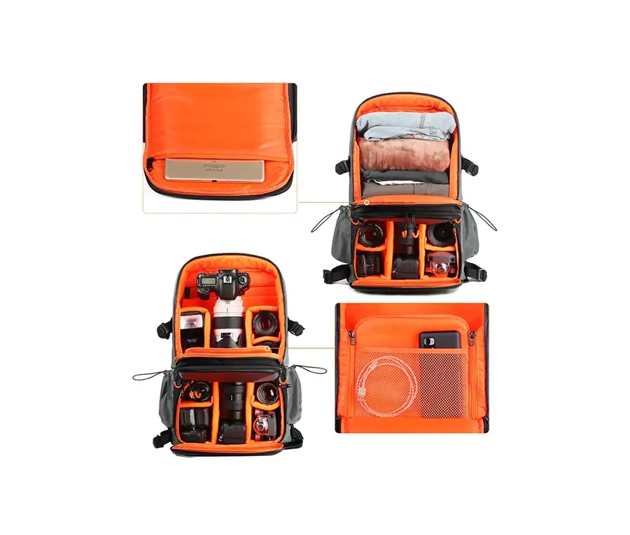 این کیف دوربین با ابعاد خارجی 34×24×54 سانتیمتر طراحی شده و دارای فضای داخلی مناسب برای قرار دادن دوربین، لنزها و لوازم جانبی مختلف است. این کیف دارای چندین جیب جداگانه برای سازماندهی بهتر وسایل است، از جمله یک جیب اصلی با پارتیشنهای جداکننده برای نگهداری دوربین و لنزها. همچنین، این کیف دارای جیبهای متعددی در قسمتهای مختلف خود است که میتوان از آنها برای نگهداری لوازم شخصی، سهپایه، بطری آب و حتی تبلت و لپتاپ استفاده کرد.
