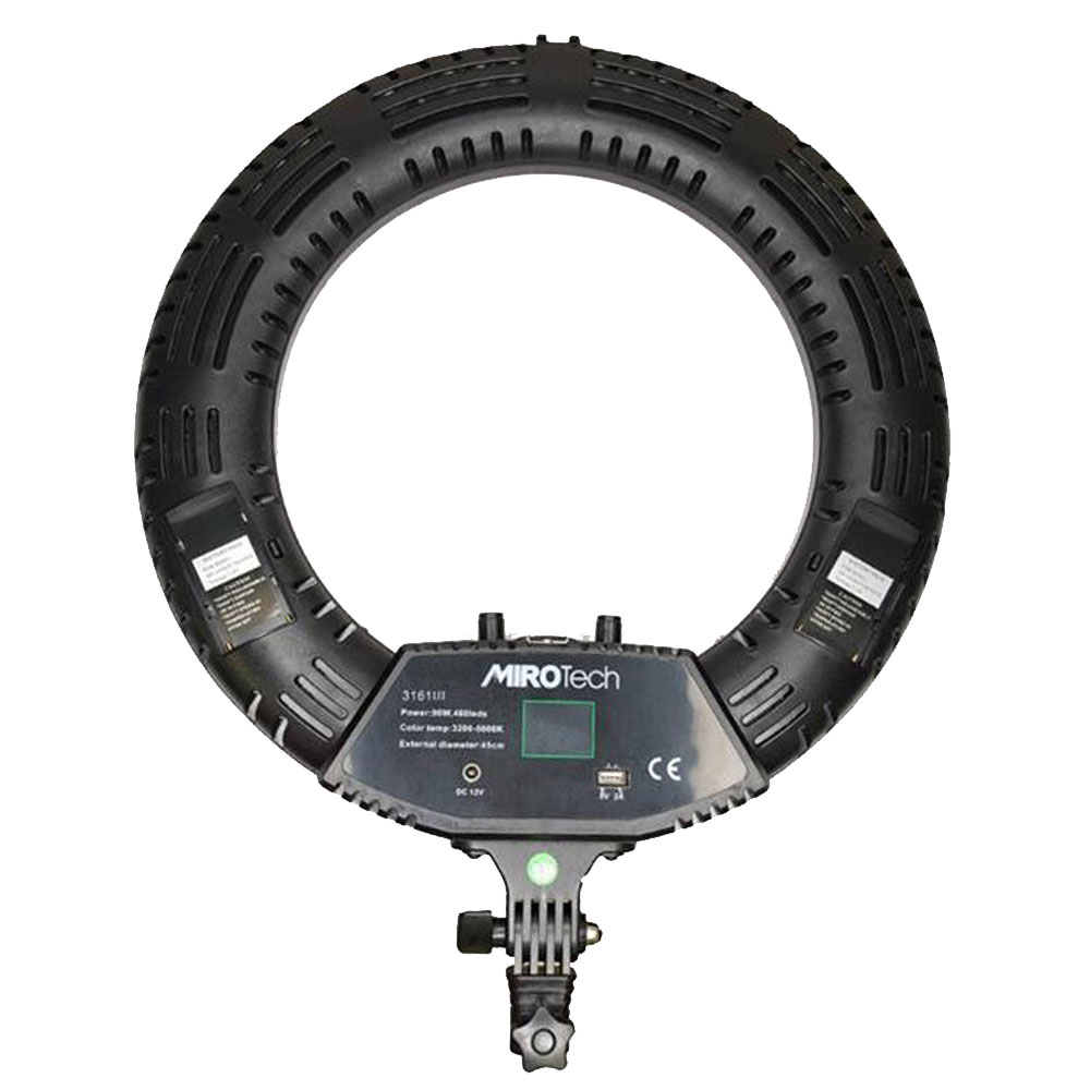 رینگ لایتها به دلیل انتشار یکنواخت نور بر روی سوژه و جلوگیری از ایجاد سایه به دلیل ساختار حلقوی خود کابردهای بسیاری داشته و امروزه نه فقط در عکاسی پرتره و برای تبلیغات و مدلینگ، بلکه در میان دیگر گروهها نظیر سالنهای آرایشی، ولاگرها و اینفلوئنسرهای فضای مجازی نیز جایگاه خود را پیدا کرده و بسیار محبوب هستند. رینگ لایت میروتک MiroTech Ring Light SY-3161 III یک رینگ لایت با قطر 45 سانتیمتر و توان 96 وات بوده که ضمن برخورداری از قابلیتهای متعدد نظیر امکان استفاده از شارژ باتری و یا برق مستقیم، امکان نصب گوشی و آینه بر آن، برخورداری از نمایشگر تنظیمات و موارد بسیار دیگر یک منبع نور همهکاره بوده که میتواند نیاز گروههای کاربری مختلف را برطرف سازد. اگر قصد خرید رينگ لايت عکاسی میروتک MiroTech Ring light SY-3161 III را دارید، با ما همراه باشید تا در ادامه ضمن بررسی ویژگیهای محتلف این رینگ لایت، دید بهتری از آن در اختیار شما قرار دهیم.