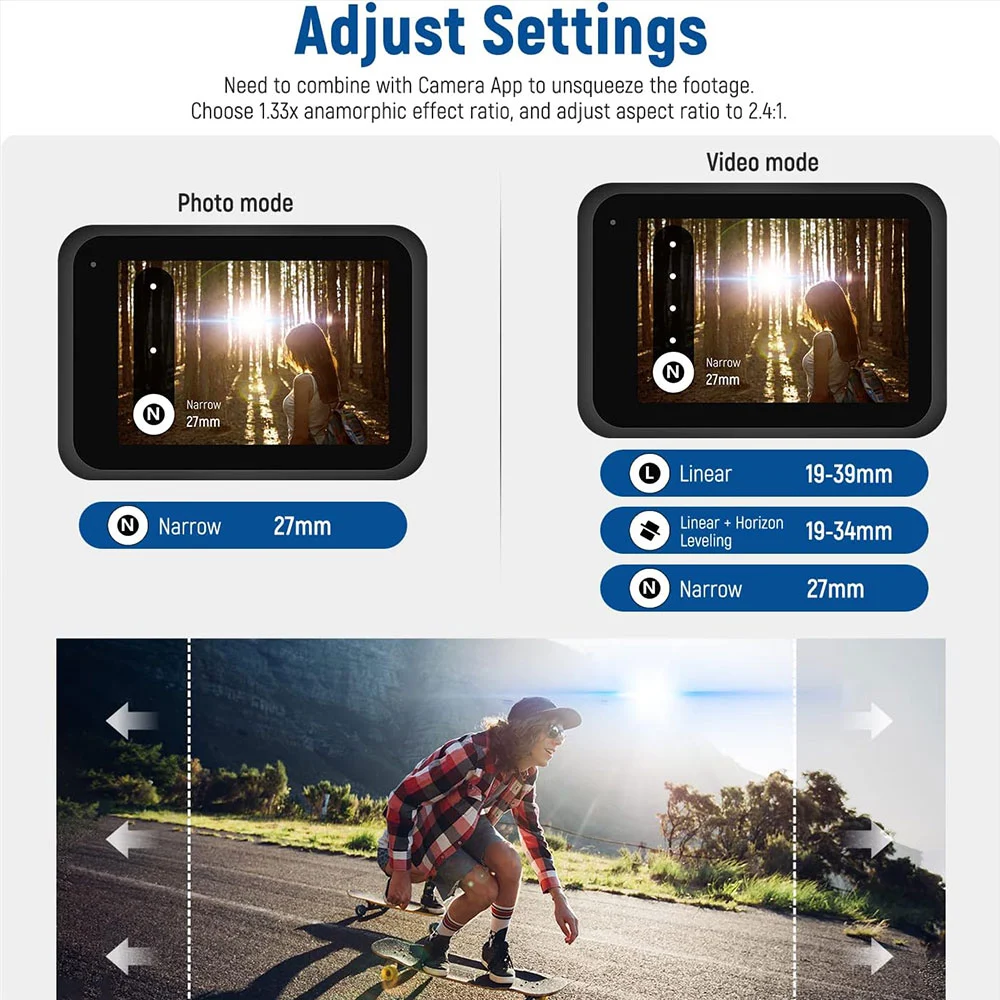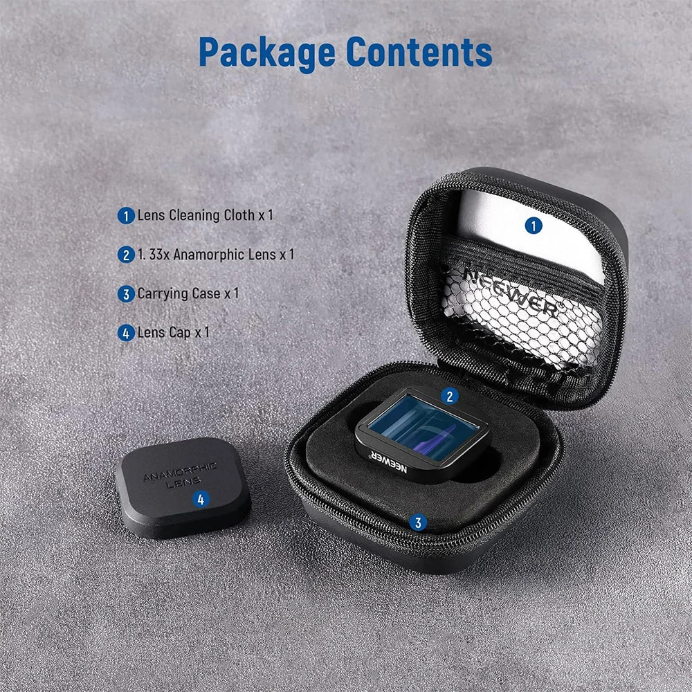 لنز آنامورفیک نیور با بزرگنمایی 1.33 برابر، صحنههای وسیعتری را بدون افت کیفیت ثبت میکند. پوشش ضد انعکاس HD کیفیت تصویر را بالا میبرد و بازتاب نور را کاهش میدهد. با ابعاد ۱۲.۴×۸.۹×۴.۹ سانتیمتر و وزن ۹۹ گرم، نصب آن روی گوپرو بسیار آسان است. فاصله کانونی ۱۷ تا ۲۷ میلیمتر نیز این لنز را برای فیلمبرداری حرفه ای در فضاهای باز و محیطهای پرتحرک ایدهآل کرده است.