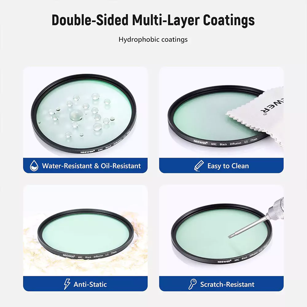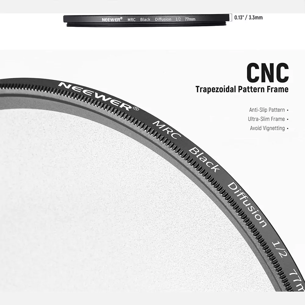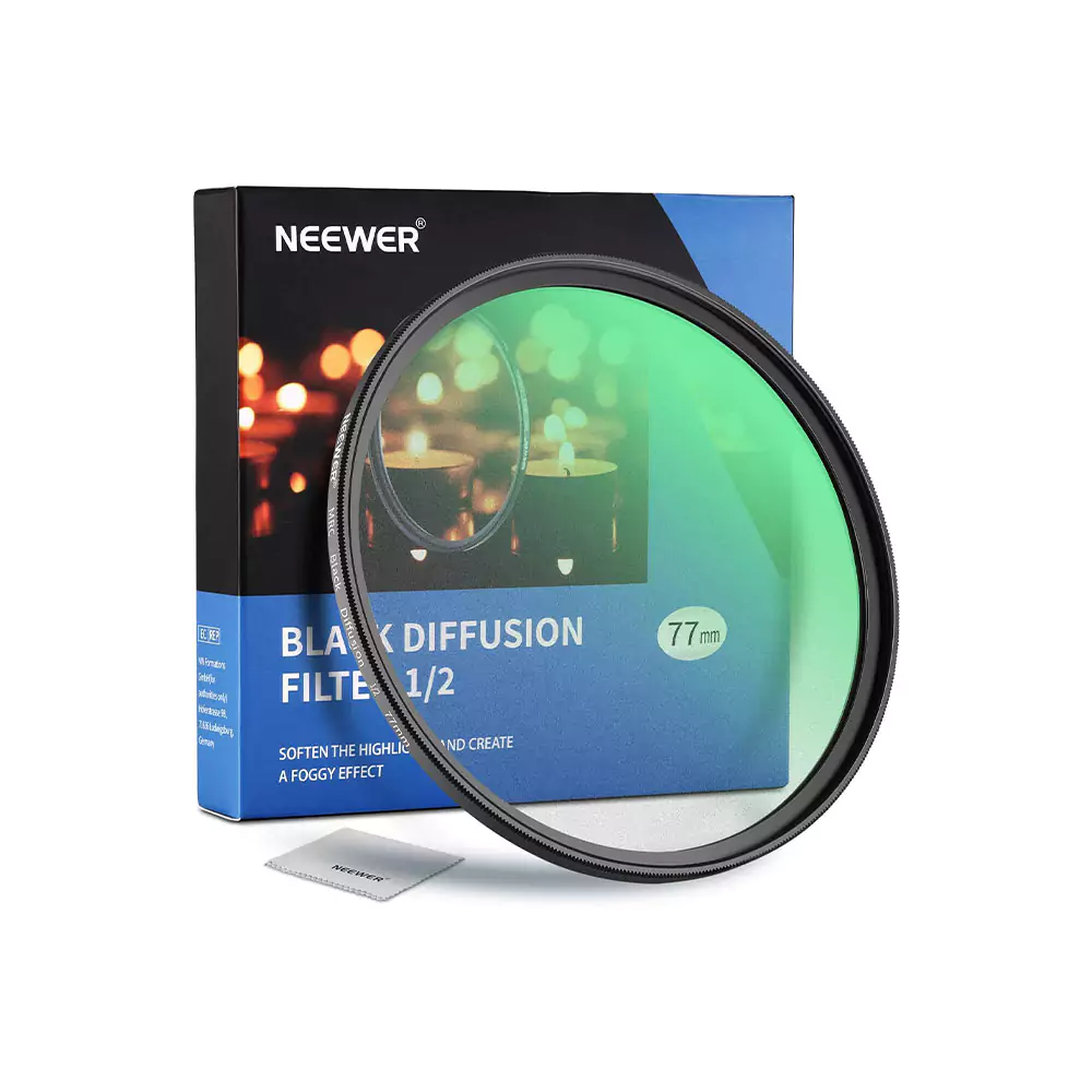 فیلتر لنز 77 میلیمتر نیور (Black Diffusion 1/2) یک فیلتر مخصوص عکاسی و فیلمبرداری است که بهمنظور ایجاد افکتهای سینماتیک طراحی شده است. این فیلتر با کاهش کنتراست و نرم کردن تصویر، به ایجاد جو و حس خاص در تصاویر کمک میکند. همچنین، سایهها را ملایمتر کرده و نواقص صورت و جزئیات ناخواسته را کاهش میدهد.