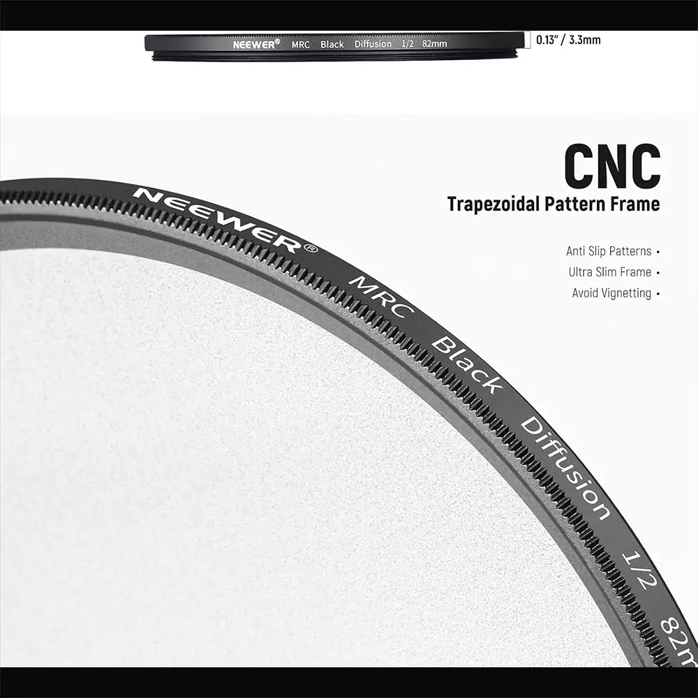 فیلتر نیوور NEEWER Black Diffusion 1/2 با اندازه 82 میلیمتر مناسب لنزهایی است که دهانه آنها (filter thread) 82 میلیمتر قطر دارد. این اندازه معمولاً روی بدنه لنزها نوشته شده است. برخی از لنزهای معروف با این اندازه شامل موارد زیر است: