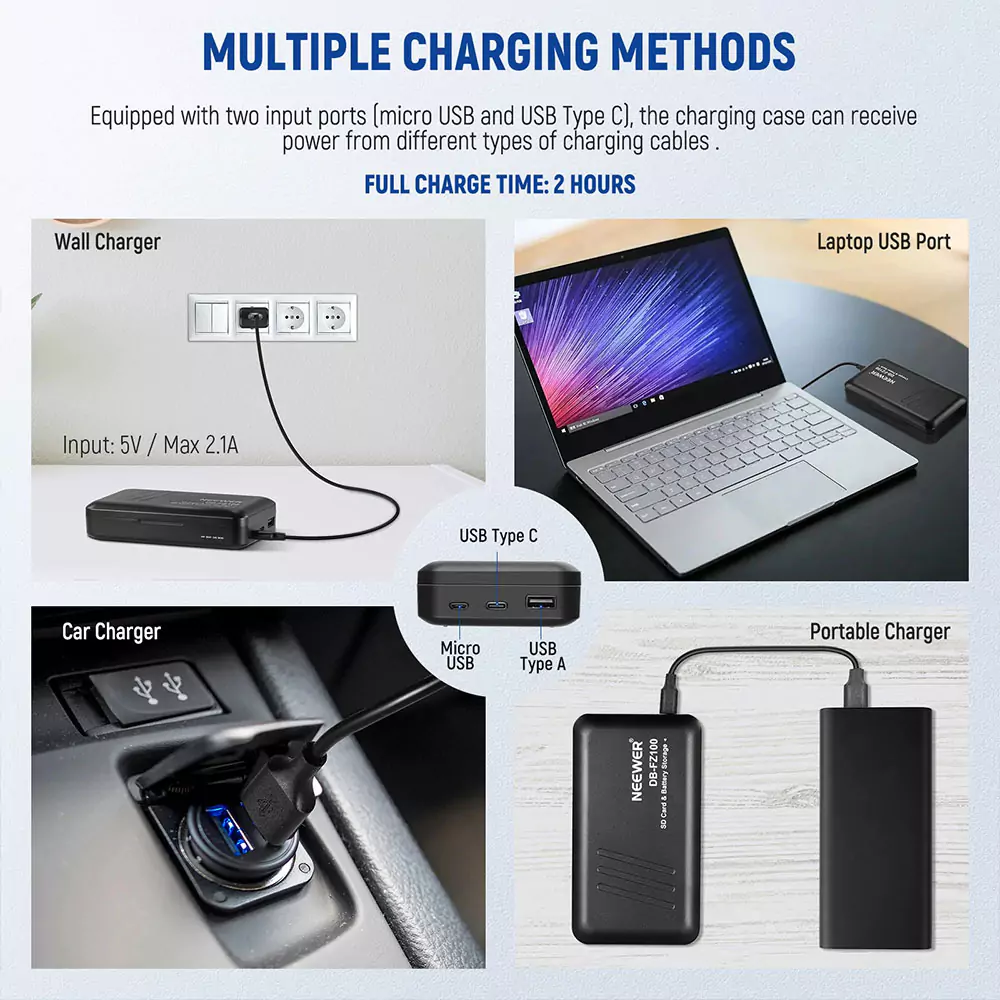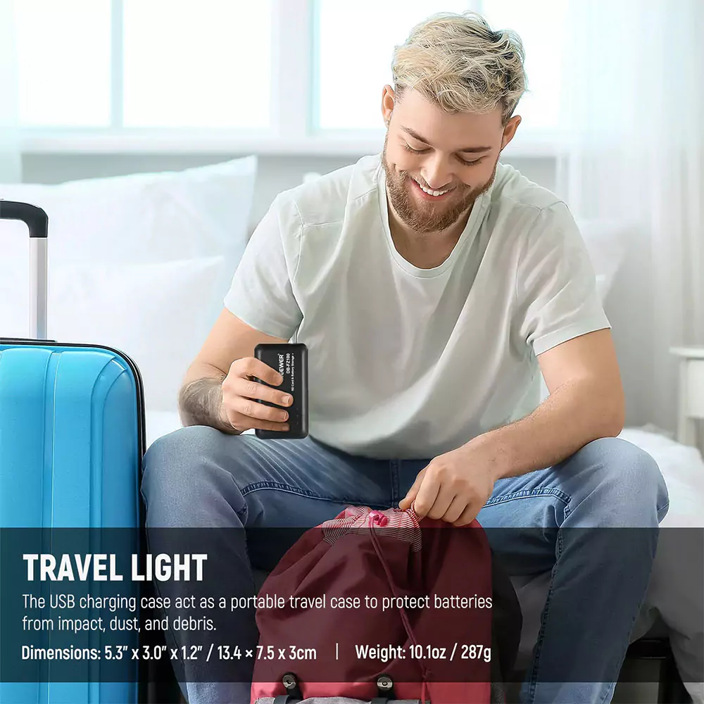 کیس شارژ USB این محصول دارای دو درگاه micro USB و USB-C است و میتواند دو باتری را همزمان شارژ کند. ولتاژ ورودی 5V 2.1A و توان خروجی 8.4V/1000mA برای یک باتری و 8.4V/500mA برای دو باتری است. علاوه بر شارژ، این کیس به عنوان یک کیف مسافرتی قابل حمل عمل میکند و باتریها را در برابر ضربه و گرد و غبار محافظت میکند. همچنین دارای دو جای کارت SD و یک پورت USB نوع A برای شارژ گوشی در حین حرکت است.