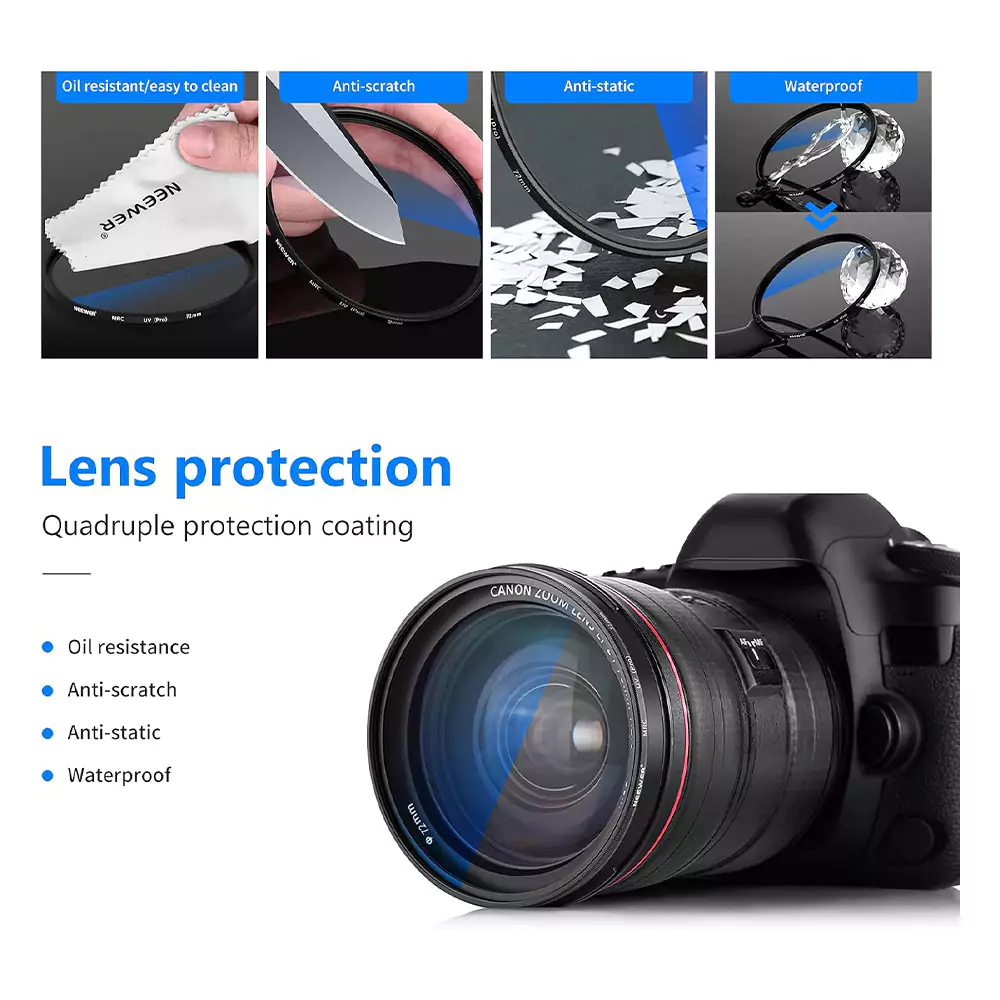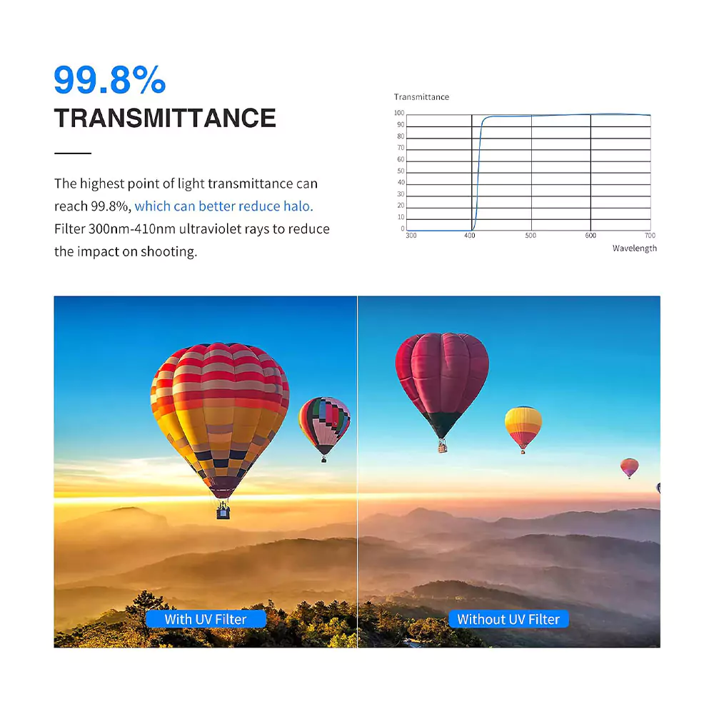 این فیلتر به عنوان یک فیلتر حفاظتی برای لنزهای مختلف مناسب است و میتواند از آنها در برابر آب، خراشیدگیها و … محافظت کند.