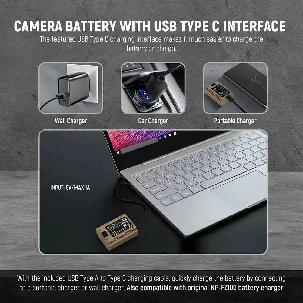 این باتری علاوه بر وزن سبک، دارای قابلیت شارژ سریع نیز هست. این ویژگیها به کاربران این امکان را میدهد که به راحتی از باتری دوربین عکاسی استفاده کنند و در حین حرکت یا در شرایط مختلف، به راحتی آن را حمل کنند.بهعلاوه، همراه با باتری NP-FZ100، یک کابل USB-C نیز ارائه میشود که فرایند شارژ را آسانتر و سریعتر میکند. این باتری به عنوان یک منبع تغذیه کارآمد و قابل اعتماد، به شما این امکان را میدهد که بدون هیچ گونه وقفهای از دوربین خود استفاده کنید و از لحظات ویژه زندگیتان عکس و فیلم بگیرید.