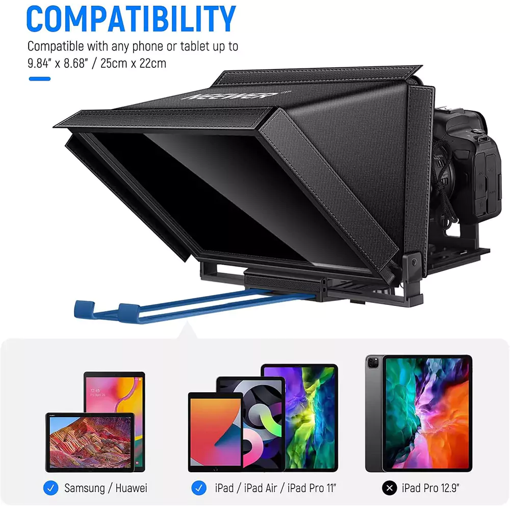 - ابعاد سازگار برای دستگاههای مختلف: این تله پرامپتر برای دستگاههایی مانند iPad و تلفن همراه با عرض 9.84 x 8.68 اینچ (25cm x 22cm) مناسب است.