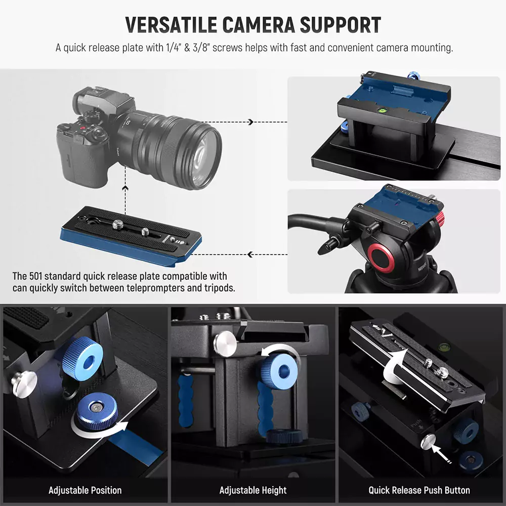 یکی از ویژگیهای برجسته این محصول، قابلیت تنظیم زاویه و ارتفاع صفحه نمایش است که امکان مشاهده متون از زوایای مختلف را فراهم میآورد. این دستگاه به صورت ویژه برای استفاده با دوربینهای DSLR و سایر دوربینهای حرفهای طراحی شده و دارای یک پایه با قابلیت تنظیم است.
