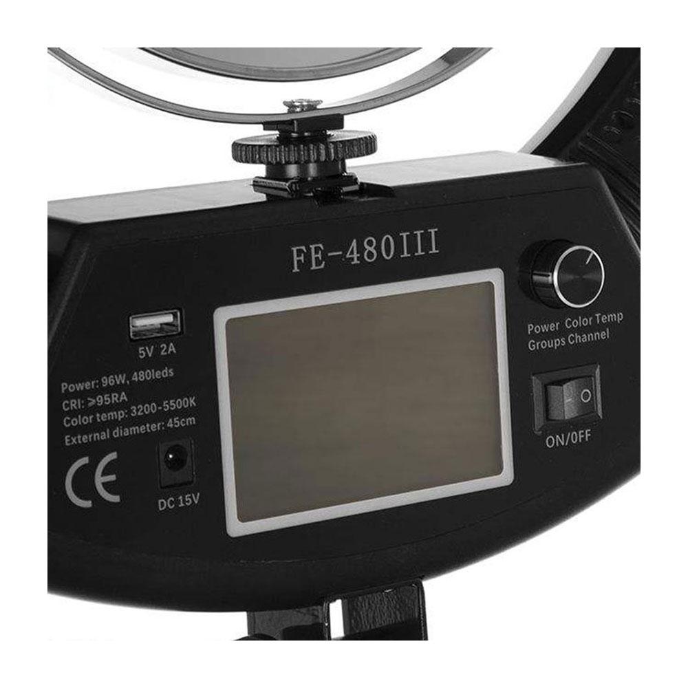 این محصول دارای وزنی سه کیلوگرمی است و با توان 96 وات از 480 عدد لامپ LED برخوردار است. این رینگ لایت دارای نمایشگر تنظیمات است. به همراه این محصول یک کیف، ریموت، آینه آرایشی، هولدر نگهدارنده موبایل و دوربین و یک آداپتور AC دریافت خواهید کرد. بدنه اصلی این محصول به رنگ مشکی طراحی شده و قابلیت نصب و تنظیم بر روی سه پایه را دارد.