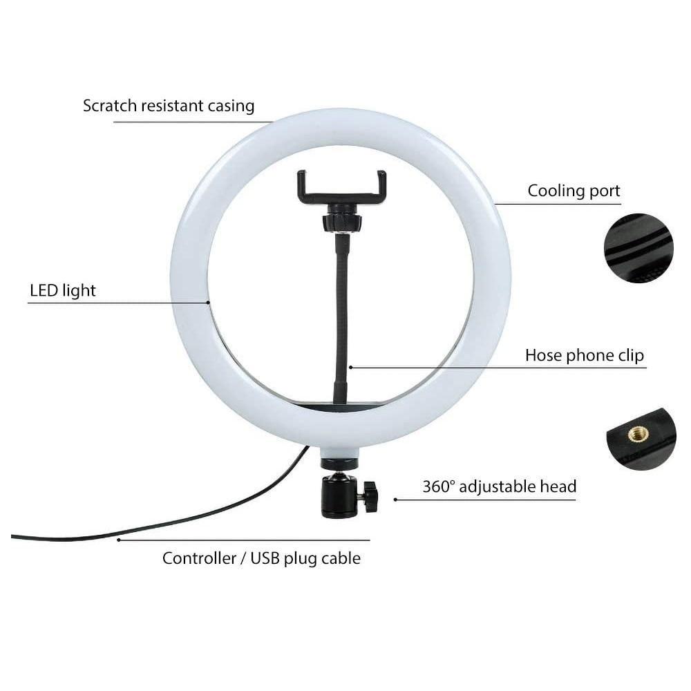 اندازه رینگ لایت برابر 26x36x26 سانتیمتر طراحی شده است. رینگ لایت Ring Light FRL-260r دارای سه طیف رنگی: نور سفید، نور گرم و نور میانه است. چراغها دور تا دور حلقه قرار گرفتهاند و انتخاب رنگ با کنترلر روی کابل به آسانی قابل کنترل است. قطر این حلقه 26 سانتیمتر است. میتوانید شدت و میزان تابش نور را تنظیم کنید. در قسمت پایین کنترلر بعد از دکمههای تنظیمات نور، دکمه خاموش و روشن دستگاه قرار دارد. یک هولدر موبایل برای رینگ لایت FRL-260r در نظر گرفته شده است؛ که میتوانید گوشی خود را با اطمینان کامل به آن متصل کنید. اگر عرض تلفن هوشمند شما بین 5.2 تا 10.5 سانتیمتر باشد به راحتی میتوانید از هولدر بهره ببرید. پورت usb نقطه قوت رینگ لایت FRL-260r به حساب میآید؛ با این امکان قابلیت استفاده در هر موقعیتی برای شما فراهم است و میتوانید با هر دستگاهی شارژدهی انجام دهید و نهایت استفاده را ببرید.