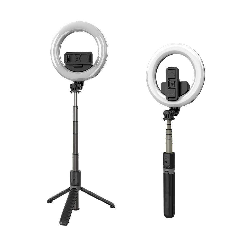 علاوه بر رینگ لایت بلوتوثی شاهد یک مونوپاد با قابلیت تبدیل شدن به سه پایه، ریموت برای کنترل از راه دور و کابل برق مشاهده میشود.