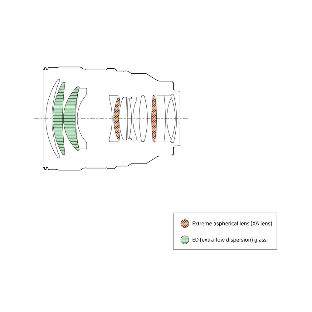 برند سونی در ساخت این لنز از عدسیهایی استفاده کرده است که پوشش خاصی روی سطح آنها را پوشانده است. وجود این پوشش سبب بهبود کنتراست و همچنین کاهش انعکاس نور میشود. از دیگر ویژگیهای ظاهری این لنز میتوان به دیافراگم 11 تیغه و همچنین ساختار متشکل از این 11 گروه و 14 المان آن اشاره کرد.