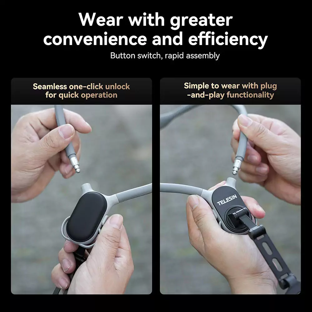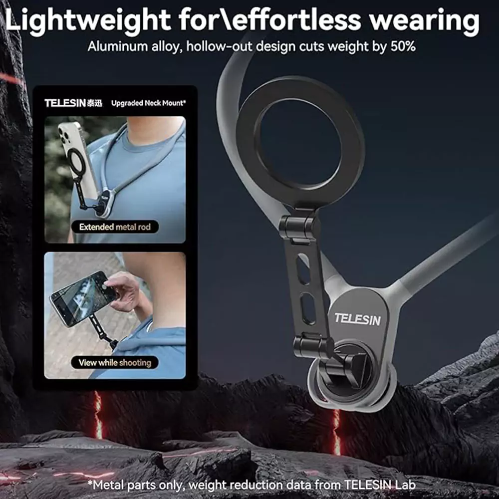 هولدر گردنی موبایل Telesin MNM-002 بهویژه برای گوشیهای هوشمند و دوربینهای حرکتی طراحی شده است. این محصول از یک لوله با طول 70 سانتیمتر (در حالت باز کامل) بهره میبرد که به راحتی میتواند بر روی گردن یا شانه شما قرار گیرد.