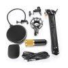 کیت westcott BM800، علاوه بر میکروفون، شامل یک استند تاشوی فلزی برای قرار دادن میکروفون روی میز، یک عدد پایه میکروفون ، یک گیره فلزی برای پایه، یک کابل میکروفون، دو عدد آداپتور تبدیل microUSB به 3.5mm، یک عدد کابل USB به microUSB، یک ضدلرزش و یک کیس فلزی است. یک پاپ فیلتر نیز درون این کیت قرار دارد. شاید برایتان سوال باشد که پاپ فیلتر چه کاربردی دارد و چرا برای میکروفونهای استودیویی و مخصوص اجرا ضروری است. گاهی اوقات، تلفظ صداهای سوت مانند همچون “س” و “ش” و همچنین برخورد اجتنابناپذیر هوا به میکروفون به دلیل بسته شدن لبها پس از تلفظ صداهای صامت مثل “ب” و “پ”، باعث نویز انفجاری یا همان نویز پاپ میشود. این نویز در میکروفونهایی که صدا را دقیقتر دریافت میکنند، بیشتر است. در نتیجه، میکروفون BM800 نیز از نویز پاپ در امان نیست؛ بنابراین با یک پاپ فیلتر مخصوص در دسترس کاربران قرار گرفته است. این کیت، حتی یک فوم بادگیر نیز دارد، تا عدم وجود نویز را اطمینان دهد. شایان ذکر است که میکسر کیت، دو عدد ورودی میکروفون، پورت USB 2.0، پورت USB 3.0، ورودی آنالوگ TRS، خروجی آنالوگ TRS، دو خروجی دیجیتال و دو خروجی هدفون دارد.