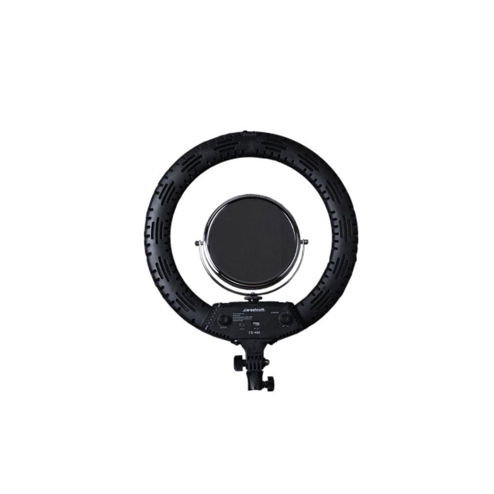 کیفیت بسیار بالای مواد اولیه استفاده شده برای تولید این محصول نه تنها ظاهری زیبا و حرفهای برای این رینگ به ارمغان داشته است، بلکه از لحاظ کیفیت کاربری نیز این رینگ را در دسته بهترین رینگهای نوری گنجانده است. این رینگ زیبا و با کیفیت با پایهای به رنگ مشکی به دست شما میرسد. این رینگ از قدرت خروجی 65 وات برخوردار است و به همراه رینگ، لایت، آینه، هولدر موبایل، آداپتور برق، کیف و سه پایه به شما عرضه میشود. رینگ لایت وسکات Westcott Ring Light FE-460 دارای زاویه نوردهی 90 درجه است و بدون باتری کار میکند. بر روی این دستگاه درگاه USB نیز تعبیه شده است. قطر بیرونی این رینگ 45.72 سانتیمتر است و با 460 عدد لامپ LED مجهز شده است. دمای رنگ این رینگ 5500-3200 درجه کلوین است. سه پایه قابل تنظیم این رینگ به راحتی امکان تنظیم نور راحتتر را برای شما فراهم کرده است.