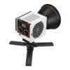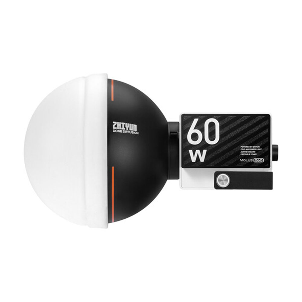 همانطور که پیشتر اشاره شد و البته در نام آن نیز مشخص است، ویدئولایت ژیون Zhiyun MOLUS G60 Bi-Color Pocket COB Monolight (Combo Kit) با داشتن وزن 300 گرم و ابعاد 90 x 67 x 67 میلیمتر یک ویدئولایت جیبی بوده و به همین دلیل نیز شما کار راحتی در نگهداری و حمل آن خواهید داشت. در قسمت جلویی این ویدئولایت منبع نور COB LED آن با طیف دمای رنگ 2700 تا 6500 کلوین، قابلیت تنظیم شدت نور (Dimming) صفر تا صد در صدی و ریتینگ بالای CRI/TLCI 96/97 تعبیه شده و در بالای آن دکمه خاموش/ روشن و توری هوا قرار دارد؛ گفتنی است که کار خنکسازی این ویدئولایت توسط فنهای FOC و هیت سینکهای موجود در آن و با بکارگیری سیستم خنککنندگی DynaVort صورت میگیرد که ضمن فراهم ساختن امکان خنکسازی فعال داخلی، از داغ شدن این ویدئولایت به هنگام استفادههای طولانی مدت جلوگیری خواهد کرد.