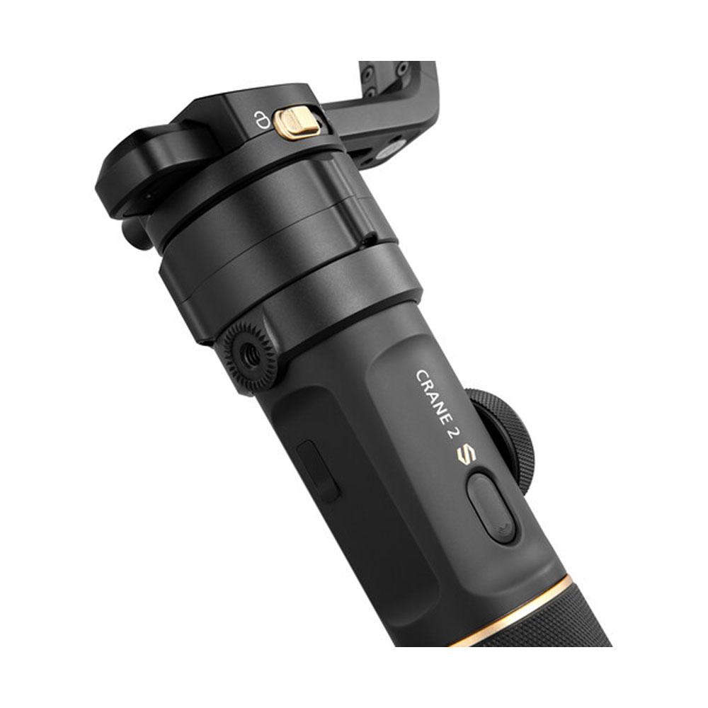 دسته این گیمبال، از فیبر کربن ساخته شده است تا علاوه بر جانسخت بودن و ارائه عملکردی مطمئن، وزن زیادی را بر فیلمبرداران تحمیل نکند و با این حال بتواند ظرفیت بار بالایی داشته باشد. در جلوی CRANE 2S، یک صفحه نمایش ۰٫۹۶” OLED قرار گرفته است که با اندازه بزرگش، نظارت و کنترل صحنه را آسان میکند. با این صفحه نمایش میتوانید تنها در کسری از ثانیه تنظیمات را از طریق منو اعمال کنید و حالتهای فیلمبرداری را تغییر دهید. ژیون کرین ۲S از یک مکانیزم قفل محور بهره میبرد که به کمک آن میتوان حرکت گیمبال را هنگام حمل و نگهداری قفل نمود. گیمبال به صورتی طراحی شده که برای کار تیمی با حداکثر کارایی آماده باشد. به این منظور، یک شیار برای نصب فرستنده تصویر در نظر گرفته شده است. گیمبال CRANE 2S، چندین نقطه مانت را در دسترس کاربران قرار داده است: یک شیار پیچ ۱/۴″ در پشت صفحه رهاسازی سریع تعبیه شده تا دوربین بتواند بین دستگاههای مختلف مثل سه پایه و اسلایدر جابجا شود؛ به علاوه دو شیار پیچ ۱/۴″ دیگر و یک شیار پیچ ۳/۸”.